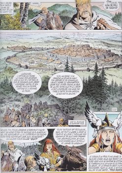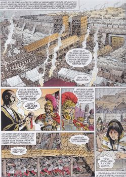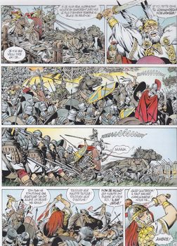 remarques: | le siège de Avaricum (Bourges) par César où se déroule la même tragédie qui se déroulera à Alesia un peu plus tard, la cité est encerclée et les troupes de Celtill à l'extérieur ne réussissant pas à percer le blocus, ce sera César qui gardera l'initiative >> p.12 mort de Adua qui aura hurlé comme une louve jusqu'à la fin pour appeler à l'aide son amant Boadicae se rend à Lutèce pour rallier les tribus du nord à Celtill, alors que Labienus reçoit le renfort de deux légions fournies par Pompée et part faire le siège de Lutèce >> p. 17 la cité de Lutèce répartie sur 2 îles au milieu de la Seine siège de Lutèce où Milon et Ambre se retrouvent après une longue absence >> p. 32 mil, milon, mille, mille putains et une chiée de romains dixit Cloduar >> p. 38 à voir: le casque "casserole de Milon" et la mort courageuse du vieux brenn Camulogène venu à la rescousse de Lutèce Boadicae et ses amis réussissent à s'extirper de la bataille de Lutèce et retournent vers Gergovie alors que le brenn Lucterios part à la recherche du mystérieux Critovax début du siège de Gergovie où Ambre endosse pour la première fois le casque gaulois ailé de la victoire >> p. 44 vue sur la cité de Gergovie >> on se réfère beaucoup sur la quête amoureuse de Milon et d'Ambre dans cet album de stratégie peu claire concernant Labiénus (à qui Pompée accorde déjà bien des faveurs et qui quittera César par la suite), mais scenario et graphisme restent respectables |