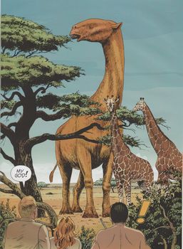 remarques: | série parallèle aux mondes d'Aldebaran, de Betelgeuse et d'Antarès mais avec un thème différent (il ne s'agit plus ici de colonisation mais de phénomènes paranormaux) Mombasa en 1947, une jeune anglaise Miss Austin est envoyée au Kénya pour enquêter sur de curieux phénomènes ayant affecté l'expédition de l'écrivain Remington dont le safari a mystérieusement disparu n.b. ce safari était commandité par Remington accompagné de sa femme, deux autres touristes et un guide + deux porteurs noirs le récit commence par la description de Remington qui a un fichu caractère, buveur invétéré, presque obsédé sexuel avec scènes de jalousie, Remington qui se soulage dans la savane "ça fait du bien", etc clin-d'oeil probablement de Remington se référant à Hemingway >> p. 8/9 une chasse au lion où l'on tombe sur un dinosaure >> p. 12 aperçu du dinosaure parmi un troupeau de girafes miss Kathy Austin, en fait un agent du MI5 anglais sous l'identité d'un professeur de langues, commence son enquête en questionnant un rescapé noir du safari >> p. 25 l'excursion en avion avec le pilote Grabble (clin d'oeil à Clark Gable) >> p. 29 visite au palais du comte di Broglie dit le baron qui habite un palais perdu dans la savane construit avec l'aide de Churchill (!!) avec salle de bain en marbre mais sans eau courante!! >> p. 36 lors d'un autre vol avec Grabble, Austin découvre un cratère géant avec les restes calcinés d'un "diatrima steini" = autre genre de dinosaure >> p. 39 quel beau texte dans un dialogue entre Austin et un autre agent du MI5! (langage petit nègre?): - qu'est ce qu'il fait soif, réponse: "j'ai encore, merci" finalement Kathy Austin décide d'organiser une expédition plus importante alors que des soi-disantes soucoupes volantes apparaissent en dernière page avec les paroles de Kathy Austin "mon dieu, elles reviennent" alors qu'aucune autre apparition s'est manifestée dès le début de l'histoire >> introduction de la série très très pauvre et vulgaire (malgré la richesse africaine environnante) où la science-fiction, l'aventure, le monde perdu de Doyle et la musique de Glenn Miller se cotoyent joyeusement le scénario est vraiment nul, le texte idem, seul le graphisme de Leo influençé par celui de Rodolphe est quelque peu acceptable un début de série vraiment décevant (une toute petite étoile pour le graphisme) |