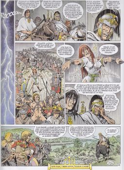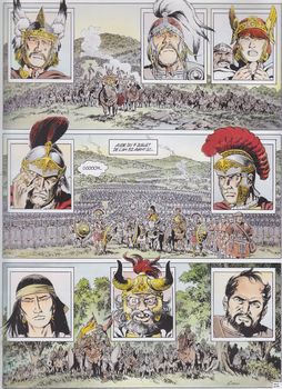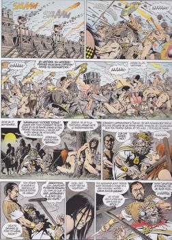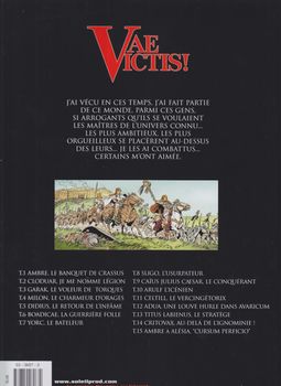 remarques: | cursum perficio " ici s'arrête mon chemin" et celui de la série! César fait retraite vers les légions de Labiénus alors que Celtill ne tire pas plus avantage de sa victoire à Gergovie, malgré l'appui des héduens Eporedorix et Viridomaros, son point faible restant toujours le manque de cohésion dans l'armée gauloise quant à Milon, il est toujours prisonnier de Critovax alias Didius qu'il soigne le mieux possible pour rester en vie, mais l'or de César sera déterminant pour faire basculer les germains de son côté, au détriment de Celtill et pour triompher à Rome, César doit triompher en Gaule >> p. 8 Didius qui reprend des forces grâce à Milon et qui se gave de fraises le 7.7. 52 BC une bataille décisive s'engage >> p. 24 les principaux antagonistes les gaulois repoussent les romains, mais la cavalerie germaine intervient et les gaulois doivent décrocher, Celtill se retranche dans Alésia commettant ainsi sa deuxième grande erreur n.b. le siège d'Alésia se déroule assez fidèlement à l'histoire, sauf pour la sortie de la cavalerie gauloise qui en grande partie ne réussit pas à traverser les lignes romaines pas encore complètement fortifiées et le récit de Rocca ne mentionne que brièvement l'intervention de l'armée de secours gauloise lors de la sortie de la cavalerie gauloise, Ambre est capturée par les germains qui l'amènent à Didius qui veut lui faire subir le même sort qu'à Milon, César avec l'aide des germains est vainqueur sur toute la ligne et oblige Celtill à capituler, par la même occasion, il fait exécuter Didius et prend le commandement du contingent germain (en fait on se demande comment Didius dans son état ait pu devenir le chef de 30'000 cavaliers germains) >> p. 47 la reddition de Celtill, c'est vraiment vae victis Milon est libéré et dans un premier temps, Ambre est gardée prisonnière avec Celtill, puis confiée à Milon qui reste sous la protection de César tandis que l'ambact allobroge Cloduar quitte les gaulois pour suivre sa reine qu'il espère pouvoir un jour délivrer des romains >> un assez bon album mais la fin est un peu précipitée et le scénario s'attarde un peu trop sur les deux véritables amoureux de la série tandis que le graphisme reste respectable c'est la fin de la série en 2006 après 15 albums parus et à fin 2012 après 6 années, il n'y aura toujours pas de suite à Vae Victis |