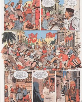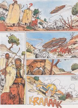 remarques: | la soucoupe des dieux doit se poser en Turquie pour réparations, Bastet se sépare de Ian, Jane et Ferregus >> p. 7 les bergers turcs avec leur "kepenek" une révolte turque est fomentée par Shan Pacha alias Schultz en prenant les arméniens d'Adana comme prétexte Ian et ses amis sont faits prisonniers par les turcs de Schultz tandis que Bastet cherche un endroit idéal pour installer sa soucoupe et pour surveiller Ian Kalédine, elle installe un capteur-translateur (= transmetteur de pensées et teleporteur) avec l'aide de Bastet, un groupe d'arméniens délivrent Ian et ses amis tandis que Bastet se met à la recherche de Shan Pacha pour le neutraliser, mais sur son chemin, elle sauve la vie d'une jeune arménienne de la vindicte des turcs et retourne à sa soucoupe en emmenant avec elle comme prisonnier, Harmac, l'assistant de Schultz, alors que Ian et ses amis et les arméniens sont attaqués par les turcs de Schultz, Ferregus réussit à s'enfuir avec Jane, mais Ian Kalédine est laissé pour mort >> p. 48 la bataille finale et la mort de Ian Kalédine >> la série repart dans des aventures plutôt banales et sans grand intérêt, mais toujours un bon graphisme de Ferry |