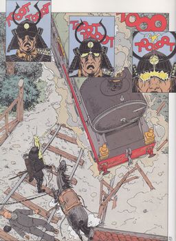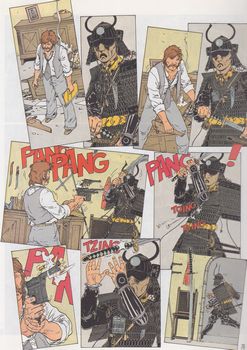 remarques: | la soucoupe noire de Shanion, alias Schultz détruit un navire de guerre japonais et débarque un samouraï noir robotique muni de puissants pouvoirs pour éliminer Ian Kalédine alors que celui-ci est chargé par le roi d'Angleterre d'éliminer Schultz >> p. 14/15 le samouraï noir qui fait dérailler un train >> p. 18 le samouraï qui peut aussi voler Ian Kalédine échappe de peu à l'attentat du samouraï, mais celui-ci s'avère n'être qu'un prototype et Schultz s'apprête à créer un armée d'androïdes, la tête du samourai (qui devrait contenir un message pour le roi) est emporté par le major Stamford, la tête explose en présence du roi et provoque sa mort alors qu'une armée de ninjas se lancent à l'assaut du château Flambard, nouvelle demeure de Ian Kalédine >> p. 40 le nouveau prototype dont la nouvelle armée d'androïdes sera composée >> p. 41 le dr Steinein qui doit trouver la parade aux androïdes de Schultz >> un album à l'action soutenue, mais surtout loufoque au scénario amélioré par rapport aux albums précédents avec aussi un graphisme bien exécuté, un bon coloriage et une couverture d'album bien réussie |