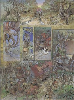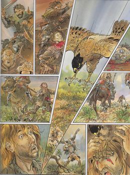 remarques: | Bras-Faucon, un capitaine manchot des gardes du prévost de Poitiers est chargé avec sa troupe de débarrasser les marais des lépreux qui s'y sont installés. >> p. 8 Bras-Faucon est assisté d'un faucon qui attaque les hommes Crapaud est capturé par Bras-Faucon et sous la torture, il révèle le chemin conduisant au camps des lépreux >> p. 25 le crucifix mutilé les antagonistes s'affronteront dans un combat final dans les marais, la vieille femme soutiendra les lépreux en faisant intervenir le Raborne (= des végétaux qui enlacent les soldats), Cognehors et le Grôle échapperont au carnage ainsi que Bras-Faucon, car on le retrouve en fin d'album comme moine manchot qui écrit son histoire >> p. 40/41 une belle planche sur le combat final >> un album dans la lignée, plein de sorcellerie et pas toujours très compréhensif, mais avec encore un graphisme respectable et une jolie couverture d'album n.b. la série ne connaîtra pas de suite, un quatrième album avait été annoncé "la Grande Goule", mais n'a jamais paru |