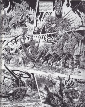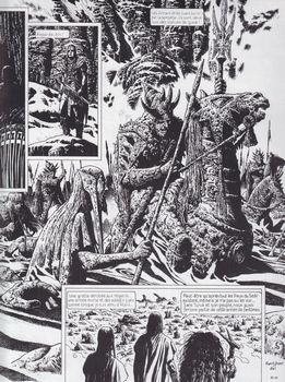 remarques: | Arn, vainqueur, part à la conquête d'Atalis où règne le prince Imrose, avec son armée, Arn doit d'abord retraverser le désert où ses troupes rencontrent de grandes difficultées, il faut d'abord trouver des points d'eau pour pouvoir continuer et sur le chemin, Arn doit aussi effronter les cheveux du dieu mort qui ne sont toutefois dangereux que la nuit >> p. 9 la passe des monts noirs >> p. 12/13 un point d'eau >> p. 16/17 le combat contre les cheveux du dieu mort puis Arn doit encore faire connaissance avec la montagne du Sedir et la progression continue dans le froid et la neige >> p. 27 sur le mont Sedir enfin la rencontre entre Arn et Imrose a lieu dans la région des lacs noirs (remplis de pétrole) où grâce à la puissance de la magie de Nera et de l'ingéniosité d'Arn qui utilise la force du feu des lacs, Imrose perdra la bataille et la vie >> p. 40 les troupes d'Imrose >> p. 46 à 53 les combats du lac noir mais vainqueur Arn est surpris par un guerrier isolé et tombe gravement touché, toutefois son corps ne sera jamais retrouvé et la légende raconte qu'il est resté en vie mais qu'il a voulu céder son trône à son jeune fils et que lui Arn vit toujours dans son peuple > un album au récit bien développé mais surtout cette fois un graphisme particulièrement bien exécuté en noir et blanc avec un grand nombre de superbes dessins, dommage que la série n'ait pas eu de suite dans ce genre |