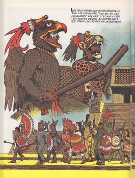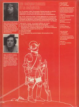 remarques: | 12.10.1492 débarquement de Cristobal Colon à San Salvador (Bahamas) en cherchant Cipango (Japon) et Cathay (Chine) avec ses 3 vaisseaux: la Santa Maria, la Nina et la Pinta, par la suite, il découvrira encore Cuba et Hispaniola >> p. 5 les féroces indiens caraïbes >> p. 7 description de Christophe Colomb = un aventurier Ponce de Leon débarque en Floride en 1512 et Hernando Cortez au Yucatan et Vera Cruz en 1519 d'où il commencera la conquête de Mexico >> p. 10/11 l'empire maya, description de leurs moeurs et culture, d'origine mongole, serait arrivé sur le continent américain par le détroit de Béring il y a 12'000 ans, héritiers de la civilisation olmèque, les mayas sont passés maîtres dans les sciences de mathématique et d'astronomie (mouvement des astres et durée de l'année solaire), une légende raconte que leur savoir provient de dieux venus du ciel (des extra-terrestres); les dieux mayas: - Quetzacoatl = serpent à plumes de l'oiseau Quetzal >> p. 29 la légende de Quetzalcoatl (le dieu blanc venu du ciel) - Illac = dieu de la foudre - Kon Tiki = bien aimé du soleil - Viracocha = dieu à peau blanche - Mixcoatl = serpent des nuages - Kukulkan = serpent marin n.b. les mayas pratiquaient passionnément le culte des serpents = symbole du savoir - le Popol-Vuh = bible des mayas - les sites mayas (encore visibles): Tikal (Guatemala), Copan (Honduras) Labua, Uxmal et Chichen Itza (Yucatan) + Palenque (Mexique), temple des inscriptions avec la fameuse pierre de Palenque >> p. 24 sur laquelle on croit voir un prêtre maya à cheval sur une sorte d'engin spatial en 1511, Guerrero échoue au Yucatan chez les mayas, en 1517 Cordoba débarque à Ekap, mais en est chassé, en suivant la côte, il découvre Champoton, en 1518 expédition de Grijalva qui bombarde Champoton et la détruit, puis il continue sur Tabasco où s'effectue une première rencontre avec les aztèques Cortez débarque en 1518 à Tabasco et s'empare de la ville, il doit se battre à Xicalanco avec 500 soldats, 15 arquebusiers, 15 cavaliers et 10 canons contre 40'000 indiens avec l'indienne dona Marina comme guide, Cortez part à la conquête de Mexico depuis Vera Cruz, ville fondée par Cortez, les totomaques deviennent les alliés de Cortez dont les soldats (appelés teules = demi-dieux par les indiens) effectuent une marche de 400 km vers Mexico, arrivée à Cholula, forteresse aztèque où s'élèvait la plus grande pyramide du monde (2x la masse de Chéops), Cortez y déjoue un piège, élimine les nobles et fait dévaster la cité par le feu, Cortez arrivera en vue de Mexico le 8.11.1519 après être parti de Vera Cruz le 16.8.1519 >> p. 65 l'empire aztèque, dirigé par Montezuma, appelé Tlacatecutli = seigneur des hommes, 2 ordres militaires supérieurs: les "jaguar" et les "aigle" armement: bouclier et cuirasse en coton rembourré armes: épée, massue, flèche, fronde et javelot (l'épée est en bois garnie de tranchants en obsidienne), peu de tactique et de stratégie, ce qui explique les victoires de l'armée de Cortez, disciplinée et munie d'armes terrifiantes pour les aztèques >> p. 68 plan de la vallée d'Anahuac avec Mexico Tenochtitlan, bâtie sur une île d'un lac reliée à la terre ferme par 3 digues ou ponts plutôt étroits >> un bon récit historique bien développé par Vernal (dommage que le récit s'arrête déjà lors de l'arrivée à Mexico) et bien dessiné par Torton, grand spécialiste de l'Amérique précolombienne et qui dessinera aussi une histoire intéressante et originale de la Bible, cet album servira de référence pour la série Quetzacoalt crée par Mitton |