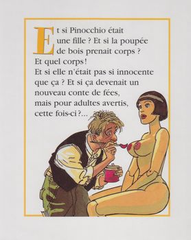 remarques: | album EO SEFAM, novembre 1995, 56 pages - le vieux menuisier Galipetto se lamente, il désire absolument une compagne pour finir ses vieux jours et se fabrique une marionnette en bois qu'il nomme Pinocchia - un beau jour, la marionnette de bois devient une poupée vivante bien en chair et pulpeuse, mais Galipetto est un peu plus tard arrêté pour détournement de mineure et Pinocchia, restée seule, part à la recherche d'un autre papa >> p. 13 l'excitante Pinocchia qui demande des câlins - Pinocchia est récupérée par un proxénète qui la fait travailler dans une maison close où elle subit entre autre les charmes de la jolie Olivia, puis Pinocchia est enlevée par deux gredins qui, leur coup réussi grâce à l'aide de Pinocchia, l'abandonne aux mains d'un aubergiste peu délicat et par la suite, Pinocchia devient strip-teaseuse >> p. 34 une Pinocchia subjugée par la grâce, enfin elle atterrit chez un directeur de cirque >> p. 38/39 contrairement à Pinocchio qui voit pousser son nez quand il dit des mensonges, Pinocchia voit ses seins se gonfler quand elle ment et pour retrouver ses seins normaux, il faut lui donner une bonne fessée - un peu plus tard, elle est jetée à la mer par deux mauvais garçons et se retrouve dans le ventre d'une baleine qui se révèle être une maison de plaisir et où elle retrouve son vieux papa Galipetto - finalement Pinocchia trouvera un amoureux et avec son vieux papa, tous les trois auront une vie heureuse, Pinocchia mettant au monde un petit Pinocchio >> p. 49 et 52 les seins gonflés et la fessée réparatrice >> un album érotique mais pas un conte de fées, le scénario est un peu banal se référant aux aventures de Pinocchio, mais le graphisme est superbe surtout de par les formes alléchantes de Pinocchia (surtout ses mignons nichons) dont le personnage est bien réussi avec une couverture d'album bien exécutée qui restera mytique dans la bande dessinée annexes - 1er et 4ème plat de l'album - une planche extraite de l'album |