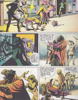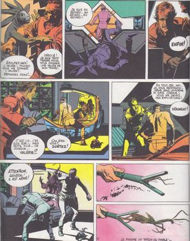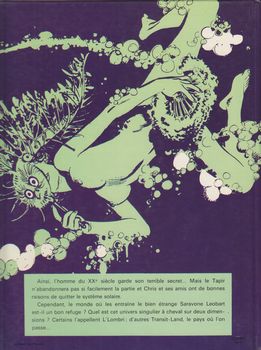 remarques: | album Hachette bande rouge, 56 pages, cette fois en couleur à Roubo-Ein Sarra (Limavan) débarrassée des trasses, Christopher est à la recherche de Valérie disparue, il rencontre Quinine, la pute, mi-femme, mi-bête qui lui parle du tapir, un machiavélique anthropomorphique périssodactyle, elle emmène Chris dans un cabaret où Valérie, devenue la favorite du tapir, est la vedette du spectacle, Christopher se lance à la poursuite de Valérie et tombe dans la machination imaginée par le tapir: faire provoquer Chris par un faux général, puis lui faire tuer accidentellement le vrai général Bibal, un héros national, avec l'arme fournie par Quinine (un phasme), Chris sera accusé du meurtre, mais le tapir interviendra pour le sauver et s'assurer ainsi la reconnaissance de Chris qui deviendra son obligé >> p. 13 les labyrinthes du grand comptoir des humeurs dirigé par le tapir >> p. 14 l'arme du crime: un phasme ou bâton du diable entretemps, Chris avec Mara se réfugient chez Savarone Leobart, un savant érudit, devenu leur ami qui après les avoir laissé chez lui, mène sa propre enquête sur l'affaire de Christopher, pour bien assurer Chris de sa bienveillance, le tapir lui rend les preuves matérielles l'accusant du meurtre, puis il organise une comédie avec la police de Limavan venue pour arrêter Christ, il s'occupe d'organiser la fuite de Chris et Mara dans son astronef Sirex III en leur faisant croire que Lisdal et Otomoro ont déjà été arrêtés comme complices >> p. 35 Bebbé le robot qui crache le feu, garde-du-corps du Tapir entretemps, Léobart rencontre Goro, le dresseur de dragons, cousin de Quinine qui fait venir Quinine et Valérie, celles-ci repenties révèlent à Léobart les intentions du Tapir, seule fausse note: Valérie a pris maintenant la place de Quinine auprès du Tapir et Quinine lui en veut à mort >> p. 38 il faut reconnaître que l'homme du XXème siècle (Chris) a plus de problèmes avec les femmes qu'il n'en a jamais eu avec le temps, l'espace et les extra-terrestres à bord du Sirex III, Tapir révèle à Christopher que le secret d'une arme extraordinaire pour repousser les trasses ou tout autre envahisseur est enfouie dans le cerveau de Chris et pour sauver le monde, il faut que Chris s'en souvienne et le fasse connaître au Tapir, mais dans son subconscient, Christopher a été conditionné pour ne livrer son secret que pour de bonnes raisons et on ne peut pas le lui faire révéler ni par la force ou la torture, on ne peut le faire qu'en le convaincant par une préparation psychologique et par la subtilité, c'est le plan du Tapir >> p. 43 le Tapir comme défenseur de l'humanité sur Limavan, Savarone Leobart avec Goro, Quinine, Lisdal et Otomoro prépare une expédition pour contrecarrer les plans du Tapir, tous s'embarquent sur le Solenopsis IV, un vaisseau plus rapide que celui du Tapir, entretemps Valerie a de nouveau disparu à l'occasion d'une météorite qui traverse l'espace, Christopher commence à se souvenir, mais ce n'est pas une arme dont il détient le secret, c'est un moyen de défense biologique qui renforce le mécanisme naturel de réparation de l'ADN (un genre de vaccin contre l'irradiation nucléaire mortelle et qui annule aussi des manipulations génétiques incontrôlablesm ce qui rend un soldat pratiquement invulnérable) c'est une arme défensive mais le Tapir veut en faire une arme offensive pour conquérir de nouveaux mondes c'est alors que l'astronef de Leobart rejoint et accoste le Sirex III qui est immobilisé par des dragons volants dirigés par Goro, Leobart perce alors la paroi du Sirex III avec un radiant, le Tapir est démasqué mais réussit à s'échapper grâce à la protection de Bebbé tandis que Leobart récupère Chris et Mara >> p. 49 l'attaque des dragons qui obstruent les tuyères du Sirex III Christopher veut retourner à Limavan pour retrouver Valérie, mais Leobart doit continuer son voyage interstellaire afin d'effectuer une mission spéciale, alors que le Tapir se ressaisit et ordonne à tous ses vaisseaux de s'emparer du Solenopsis IV >> premier album complètement en couleur, le graphisme est bien exécuté, le texte prend ici de l'importance sur les images, mais surtout le développement du scénario est captivant avec une trâme excellente sur cadre de tragédie grecque, quelle imagination! |