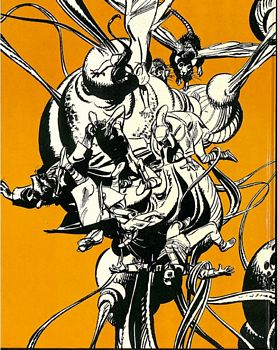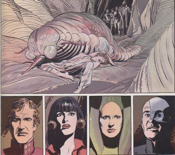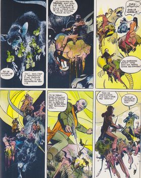 remarques: | arrivée sur Khimara Kator, le monde perdu à la frange de la constellation d'Andromède, Chris et ses amis sont accueillis par un envoyé du Tapir Anshitas >> p. 9 le voyage se poursuit sur des véhicules plutôt originaux Khimara est habitée par les maître-rêveurs qui attaquent ses habitants, la race des tapirs, en créant des hallucinations mortelles, des envahisseurs trasses sont aussi arrivés sur Khimara on arrive à un avant-poste construit sous terre d'où le voyage se poursuit avec des moyens plus rapides > p. 14 description des maîtres rêveurs: un genre de chrisalydes géantes sans membres extérieurs ni organes de perception et qui exercent sur leurs victimes une emprise mentale inexorable, ce sont des télépathes dangereux et morbides exerçant un parasitisme psychique le voyage se poursuit avec bien des mésaventures (scorpion géant mortel, des monstres troglodytes qui menacent les voyageurs obligés de traverser des conduites branlantes) >> p. 20/21 c'est vraiment de l'acrobatie aérienne >> p. 22 rencontre avec Anshitas, chef des Athopolèmes >> p. 24 la force de frappe de Bebbé Chris se rend compte que les trasses sont arrivés sur Khimara suite à la présence de Valérie et on continue vers une cellule de maître rêveur, car Valérie est sous le contrôle d'un maître rêveur qui est à son tour contrôlé par Anshitas en le maintenant en état de dépendance (mais c'est un cas unique, car les maîtres rêveurs ne peuvent pas être contrôlés mentalement) >> p. 28 Valérie sous l'emprise du maître rêveur et contre la libération de Valérie, Anshitas demande à Chris de lui révéler le secret enfoui dans sa mémoire, avec cette arme absolue, Ashintas veut éliminer les maîtres rêveurs et libérer son peuple dans le laboratoire du vaisseau du Tapir, Chris cherche à se souvenir, mais grâce à Philos, il découvre qu'il peut communiquer avec les trasses et recherche alors avec eux un accord pour libérer Valérie entretemps, Rosemayor essaie d'influencer Mara, mais n'y arrive pas, elle se tourne alors vers Lisdal pour le séduire toutefois lors de leurs débats amoureux, Lisdal découvre que Rosemayor porte le sceau de Beselek, la marque infâme des Orkands, tous deux en gardent le secret, mais Karlaïn qui les épiait en prend connaissance et cherche à faire de Mara son alliée, mais celle-ci refuse de prendre part à ses manigances Chris annonce à Anshintas son alliance avec les trasses, il a inventé un vaccin qui immunise les trasses contre la barrière des radiations protégeant les maîtres rêveurs et grâce à leur reproduction prodigieuse, ce vaccin se transmet à tous les trasses rapidement les maîtres rêveurs ne peuvent résister aux trasses immunisés et sont anéantis, Valérie est libérée par Anshitas qui contrôle le dernier maître rêveur, épargné par les trasses pour ne pas mettre en danger la vie de Valérie mais que vont faire maintenant les trasses vainqueurs? Chris a toutefois convenu avec les trasses que ce sera Valérie qui décidera, la récupération du secret de Chris est aussi abandonnée dès lors que pour le Tapir les maîtres rêveurs ont été éliminés Valérie se retire pour méditer, Rosemayor émet des doutes quant au sort de Valérie, elle redoute que les trasses ne la laissent pas partir librement, Chris lui explique alors que le vaccin inoculé aux trasses contenait aussi un élément stérile qui condamne de par leur reproduction accélérée la colonie de trasses sur Khimara à leur extinction à brève échéance mais par surprise, Valérie est enlevée par les trasses qui s'emparent du vaisseau du Tapir, toutefois Ashintas qui s'est procuré les facultés des maîtres rêveurs réussit à faire exploser le vaisseau en expliquant à Chris que la Valérie à bord du vaisseau n'était qu'un double qu'il a fabriqué pour leurrer les trasses et que la vraie Valérie est restée sur Khamira, Ashintas lui explique aussi que malheureusement sa race est atteinte de dégénérescence accentué et qu'il va disparaître dans un monde utopique pour essayer de contre-carrer cette malédiction, out donc pour le Tapir no 2 Khimara étant maintenant une planète morte, Chris et ses compagnons retournent au transmetteur où les attende une patrouille de Limavan qui a réparé le transmetteur inter-spatial et qui est chargé sous les ordres de Rosemayor de les raccompagner à Limavan, Bebbé abandonnée par Anshintas se joint à eux >> un fantastique récit à nouveau plein d'imagination et de rebondissements, inégalé jusqu'alors et admirablement développé, probablement un des meilleurs albums de la série de par sa complexité dans le scénario et avec un superbe graphisme agrémenté de couleurs très bien combinées, une pièce maîtresse du genre qui nous laisse maître-songeur vocabulaire gillonnesque: - parasitisme, état d'un être vivant qui vit sur un autre en parasite - autoclave = récipient métallique à fermeture extérieure hermétique, résistant à des pressions élevées (genre cocotte-minute) - prurit = désir irrépressible (le prurit de la gloire) - cyclothymique, la cyclothymie est un trouble de l'humeur dans le spectre de la bipolarité, au cours duquel les périodes euphoriques et les périodes dépressives et d'irritabilité se succèdent - athopolème = la race des tapirs |
