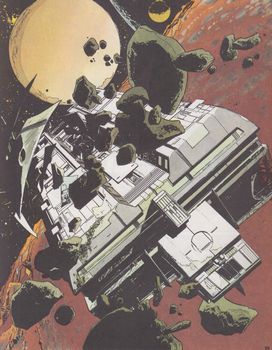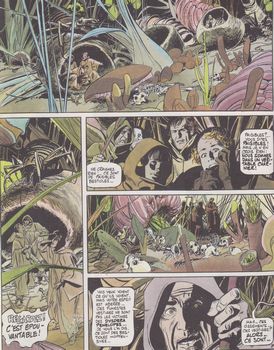 remarques: | >> p. 7 une belle planche cosmique Christopher et ses compagnons arrivent en vue du vaisseau des Ortho-mentas leur seule chance de quitter l'archipel Orkand est de rejoindre les Ortho-mentas, entretemps les moines de Beselek ont repéré les naufragés qui doivent se mettre à l'abri, Chris apprend la légende de Grandrouge et de sa petite-fille Rosemayor (élevée sur Terra sous un autre nom), Rosemayor ferait fonction de libératrice du peuple d'où la haine des moines qui veulent l'éliminer, mais c'est le contraire qui se produit et de nombreux moines commencent maintenant à l'adorer puis le voyage continue en passant à Cathedra, la ville sainte des sensitifs dirigés par le grand apôtre >> p. 19 le poste de garde devant l'entrée de Cathedra Chris élimine le garde mais Rosemayor disparaît, Chris l'abandonne temporairement, mais le commandant Malthus et ses hommes partent à la recherche de Rosemayor Chris, Valérie, Mara, Lisdal. Bebbé et le pénétrant effectuent alors leur transfert sur Floraes dans des cellules de fongoïdes >> p. 24 dans la jungle de Floraes = le terrain de chasse des moines de Beselek >> p. 27 rencontre avec les Grégaires le groupe se réfugie dans les ruines d'un ancien bâtiment, mais déjà les moines se préparent à lancer un assaut lorsqu'une barge dirigée par un robot venu depuis le vaisseau Kerberis les prend en charge à la fin du voyage, rencontre et explications par le techno-coordinateur noir qui leur fait savoir que le monde des Ortho-mentas n'est pas un monde assez bien équipé, ceux-ci survivent dans les vestiges des splendeurs technologiques du passé et n'ont pas encore trouvé le moyen de quitter leur archipel >> p. 36 rencontre avec le grand conseil = la guilde des Ortho-mentas qui sont environ 500 à survivre, prise de contact avec la jeune impertinente Elodie, petite rebelle au sein des Ortho-mentas Elodie revient un peu plus tard chercher Chris pour le présenter à Anachtéon, chef des rebelles à la guilde qui veut faire de Chris le symbole des rebelles, éliminer le pouvoir des moines de Beselek et créer un monde nouveau autre que celui reclus de la guilde des Orthomentas Chris rallie alors le clan des rebelles qui débarquent à bord de 5 barges dans les environs de Cathedra >> p. 40 votre oeil électronique me parait un peu terne dixit Mara à Lisdal >> p. 46 le sort de Malthus et de ses hommes empalés sur des pieux lors du débarquement, Lisdal est capturé par les moines, aussitôt toute l'équipe part à la recherche de Lisdal, Rosemayor et Karlaïn captif, Lisdal est amené à la révérente mère abbesse qui n'est autre que Rosemayor, devenue l'objet d'un culte par une partie des moines, elle veut en tirer profit et assurer son autorité sur tous les autres moines en voulant éliminer le grand apôtre Chris et son équipe suivent les traces de Bebbé, encore contrôlée par Rosemayor qui lui demande de la rejoindre >> p. 52 l'histoire de Rosemayor racontée à Lisdal à qui Rosemayor demande d'être son allié, mais Lisdal réussit à s'emparer de Rosemayor et à la détenir jusqu'à l'arrivée de Chris et son équipe qui s'établissent dans le monastère de Beselek, toutefois le grand apôtre avec ses troupes guidées par le traître Karlaïn assiègent le monastère qui est pris d'assaut nos amis sont pratiquement perdus, lorsque des troupes fortement armées de la guilde interviennent et déciment les moines, le grand apôtre est fait prisonnier, mais Karlaïn réussit à nouveau à s'échapper les Ortho-mentas remettent de l'ordre dans l'archipel et un beau jour, un vaisseau spatial en perdition s'échoue dans l'archipel, il est remis en état et les naufragés du temps: Chris, Mara, Valérie, Lisdal, Elodie, Bebbé et Rosemayor, maintenue captive, sont embarqués sur le Galaxircus qui tentera de rejoindre Rigel III >> p. 55 la confiance, c'est la porte ouverte à la crédulité >> p. 58 critique sur la folie engendrée parfois par les religions >> les tribulations des naufragés du temps continuent, mais le récit est quelque peu en perte de vitesse et de temps, tout en restant encore intéressant, malgré l'arrivée impromptu d'un monde circassien toutefois le graphisme reste de bonne qualitée n.b. Christopher ressemble quelque peu à Charlton Heston dans cet album et dernière apparition de Bebbé qui sera remplacée par Elodie vocabulaire gillonesque - entropie = fonction exprimant le principe de la dégradation de l'énergie, augmentation du désordre, affaiblissement de l'ordre - fongoïde = relatif aux champignons - circassien = qui concerne le cirque |