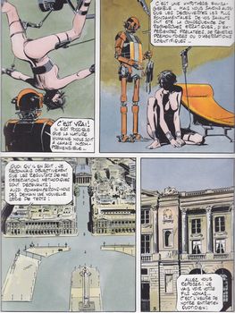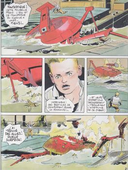 remarques: | Aude et Jonas sont à nouveau sous l'emprise des cybers dont Ulysse le cyber BX 240 qui se permet maintenant des expériences malveillantes sur Aude, mais les cybers se désintègrent lentement et sont lentement destinés à disparaître entretemps, de curieuses bestioles commencent à peupler la terre et ils ont le pouvoir d'endommager fortement les cybers avec leurs excréments; Aude est à nouveau l'objet d'expérience par Ulysse sur l'analyse de son subconscient (transition et combinaison des neurones synaptiques au niveau des terminaisons axonales) >> p. 20-23 les rêves-souvenirs d'Aude sur son enfance >> l'album finit par la mort de Jonas tué par des cybers et Aude qui veut se suicider, mais qui se métamorphose en papillon et enfin en une molécule minuscule dans le cosmos >> p. 50/51 la métamorphose d'Aude Albrespy >> un album sans grande originalité, la fin d'Aude représentant quelque peu une déshumanisation du monde au profit d'autres créatures, critique aussi sur les découvertes scientifiques, parfois la conséquence de recherches erratiques et de rêveries sans grand fondement facit: les cybers ne devraient jamais pouvoir remplacer l'homme et son imagination, le graphisme restant toujours assez bien exécuté n.b. le récit a quelque ressemblance avec le film "demon seed" ou "génération Proteus" de 1977 |