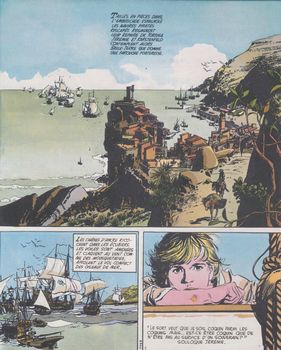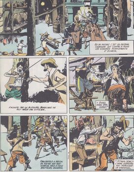 remarques: | Jérémie et Karstenfeld arrivent à San Juan pour constater que la ville a été investie par les frères de la Côte, commandés par le capitaine Roche dit Le Roc qui attend le résultat de l'expédition des boucaniers sur la ville de Arecibo, mais l'expédition est un désastre et les flibustiers rentrent à San Juan en piteux état tout le monde retourne à l'île de Tortuga, Le Roc qui visite le gouverneur Rochebrune constate que lui et son fils sont des traîtres vendus aux espagnols, Jérémie et Karstenfeld à l'auberge font connaissance avec Leocadie Lachaumette, fille du capitaine Aleyrac mort durant l'expédition et son frère, le géant Elyacin >> p. 24 le duel entre Le Roc et Le Huc >> p. 27 l'arrivée à Tortuga Le Roc démasque le gouverneur et son fils, mais pour se venger, ceux-ci font enlever Leocadie par leur homme de main Salgari qui prend aussitôt la mer avec sa victime, Le Roc, Jérémie, Karstenfeld et Elyacin jurent de ramener Leocadie et se lancent sur les traces de Salgari en direction des Bahamas >> le scénario est toujours acceptable, mais le graphisme se dégrade quelque peu n.b. la série ne sera pas continuée suite à une mésentente entre Gillon et son rédacteur lors de la pré-publication de la série dans PIF |