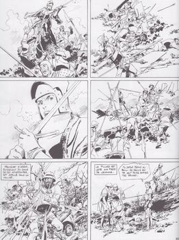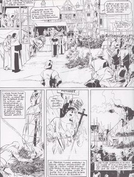 remarques: | album de 110 pages avec la suite (page 58) des aventures de la Pucelle en noir+blanc, un deuxième album en couleur (la suite de la sève et le sang) n'ayant pas paru la suite du tome 1 en couleur: la Trémoille (oncle de Gilles de Rais) et l'évêque de Chartres, monseigneur Régnault complotent contre la Pucelle alors que celle-ci cherche par tous les moyens à rejoindre Reims pour y faire couronner le dauphin Charles >> p. 61 les amours curieux de Jehanne et Gilles le 10.7. Troyes capitule ainsi que Châlons-sur-Marne et le 16.7.1429, le dauphin est à Reims >> p. 68/69 le sacre du dauphin qui devient le roi Charles VII, entouré des 12 pairs de France et sacré chevalier par le duc Jean d'Alençon et par Gilles de Rais, maréchal de France, Charles VII est désormais roi par droit divin négotiations avec le duc de Bourgogne alors que Bedford avec 10'000 soldats rôde autour de l'armée française sans engager le combat, en fait il n'y aura ni vainqueur, ni vaincu à Compiègne, le roi arrange une trêve avec la Bourgogne jusqu'à la Noël, mais devant Paris, les troupes de la Pucelle piétinent, la Pucelle veut continuer les combats, mais le roi le lui interdit, Jehanne se sent trahie >> p. 83 la fausse Catherine de la Rochelle Jehanne continue de guerroyer, mais les victoires se font plus rares, finalement elle est capturée devant Compiègne et gardée prisonnière par Jean de Luxembourg, puis vendu au duc de Bedford qui la met dans une cage de fer, enfin transférée à l'évêque Pierre Cauchon à Rouen afin de la faire comparaître devant un tribunal de l'inquisition, s'en suit le procès inique de Jehanne et sa mort sur le bûcher le 31.5.1431 Dieu, pour avoir abandonné la Pucelle, sera renié par Gilles de Rais qui se livrera à une vie de débauche (mais ceci est une autre histoire) >> à nouveau un bon récit historique à la sauce Gillon, toujours avec un bon graphisme N+B, mais qui n'égale malheureusement pas le graphisme en couleur |
