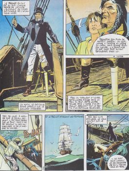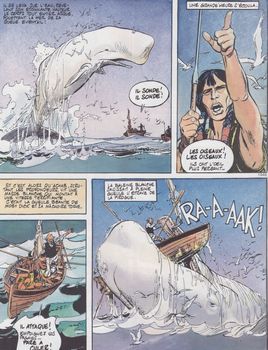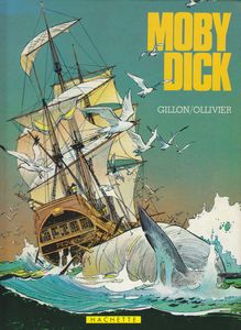 remarques: | New Bedford, port baleinier d'Amérique, Ismaël le marin et Queequeg le harponneur (fils d'un roi des îles du Pacifique) font connaissance et embarquent sur le vaisseau Péquod commandé par le capitaine Achab, unijambiste, qui eut la jambe broyée lors d'une chasse après un cachalot blanc géant le capitaine est entouré de trois seconds, chacun avec un harponneur avisé: - Starbuck, 1er second avec Queequeg - Stubb, 2ème second avec Tashtego, un peau-rouge - Flack, 3ème second avec Dagoo, un noir >> p. 15 le capitaine Achab avec sa jambe d'ivoire >> p. 16 la devise de l'équipage: morte la baleine ou périsse la pirogue Achab est à la recherche de Moby Dick, le cachalot blanc géant >> p. 24 rencontre avec un calmar géant, le kraken, le léviathan des profondeurs >> p. 27 la première baleine est abattue, puis dépecée >> p. 31 première rencontre avec Moby Dick en faveur du cachalot qui brise une chaloupe >> p. 36 2ème rencontre, les baleiniers perdent une fois de plus le combat contre Moby Dick, la jambe d'ivoire d'Achab est brisée durant la mêlée à la troisième rencontre, Moby Dick s'attaque même à la quille du Péquod y causant une voie d'eau, Achab réussit à harponner Moby Dick, mais le filin s'enroule autour de son cou et il est entraîné dans le sillage de Moby Dick qui s'acharne sur le Péquod qui finit par sombrer Ismaël fut le seul survivant recueilli par la baleinière Rachel et qui put raconter l'épique combat entre Achab et Moby Dick >> assez bonne adaptation du roman d'Herman Melville, scénarisé par Jean Ollivier et dessiné par Gillon; prépublié dans le journal Vaillant |