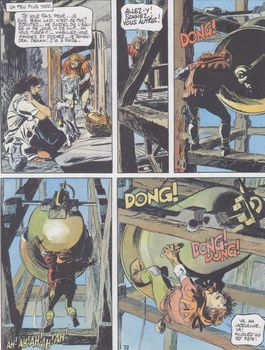 remarques: | Paris, 1466, la jolie petite fille de Paquette Chantefleurie est enlevée et remplacée par un petit monstre, sa mère le dépose devant Notre-Dame le jour de la Quasimodo, le jeune prêtre Claude Frollo l'adopte et le nomme Quasimodo n.b. la Quasimodo est une fête religieuse ayant lieu le premier dimanche après les Pâques chrétiennes 16 ans plus tard, dans la salle du palais de justice de Paris, Pierre Grégoire, un poète, écoute sa pièce de théâtre:"le mystère" devant une foule bigarrée >> p. 11 Quasimodo est élu pape par le peuple parce qu'il est le plus laid un peu plus loin, la jolie danseuse Esmeralda avec sa chèvre Djali donne un spectacle, elle est agressée dans la rue en rentrant chez elle, Quasimodo est soupconné et arrêté par Phoebus, chef des gardes du roi qui commence à s'intéresser à la Esmaralda alors que Grégoire est amené à la cour des miracles, Esmeralda sauve Grégoire de la pendaison en le prenant comme mari >> p. 20 la cérémonie du mariage >> p. 24 le supplice de Quasimodo soulagé par Esmeralda lors d'un rendez-vous entre Esmeralda et Phoebus, Frollo amoureux de la fille et jaloux, poignarde Phoebus, Esmeralda est accusée >> p. 32 Esmeralda à la chambre de la question elle est condamnée à la pendaison, toutefois sur le chemin du gibet, Quasimodo l'enlève et l'amène dans Notre-Dame en demandant l'asile religieux >> p. 38 le sonneur de cloches le procureur du roi voulant quand même s'emparer de Esmeralda, les truands décident de la mettre à l'abri, mais Quasimodo croyant qu'on veut la lui enlever, résiste à l'assaut des gueux, Louis XI en profite pour trucider les truands par sa garde, dans la mêlée, Esmeralda est enlevée et pendue, pour se venger Quasimodo tue son père adoptif Claude Frollo dont les manigances ont conduit Esmeralda à sa condamnation, les deux victimes, Esmeralda et Quasimodo déposées dans un caveau, resteront enlacées dans la mort >> une adaptation plutôt fidèle par Claude Gendrot du fameux roman de Victor Hugo, dessiné par Gillon, au style particulier et avec de jolies couleurs n.b. récit prépublié dans le Journal de Mickey |