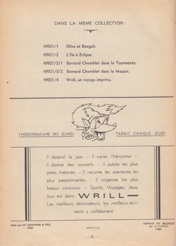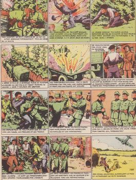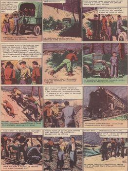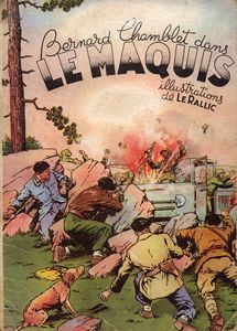 remarques: | suite des aventures de Bernard Chamblet durant la deuxième guerre mondiale, un classique l'Age d'Or de la BD, au papier et graphisme parfait, aux couleurs excellentes et avec un scenario assez bien réalisé par Le Rallic août 1940, dans la province du Berry, Bernard Chamblet toujours avec son chien Flip, organise la résistance, il devient instructeur et il dresse son chien à porter des messages november 1942, les boches envahissent la zone sud et Bernard avec ses partisans commencent une vraie guerre de guérilla, coups de main sur les occupants allemands, attentats, sabotages de trains, écluses, ponts, centrales électriques, etc >> p. 11 un parachutage de 15 colis avec 180 kg chacun = au total trois tonnes Bernard est capturé par la gestapo, des partisans déguisés en policiers boches parviendront à le délivrer >> p. 19 les maquisards plus humains que les boches début d'une guerre sourde et implacable menée contre les boches >> p. 25 attaque avec bazooka sur un convoi >> p. 27 l'accent français des allemands à nouveau capturé et mis à la torture, Bernard s'échappe in extremis avant d'être fusillé >> p. 31 les représailles des boches le 16.8.1944, les FFI rejoindront l'armée régulière des FFL (forces françaises libres) >> peut'être le meilleur album de la série avec une bonne description de la guerre de l'ombre |