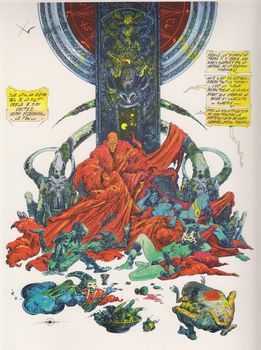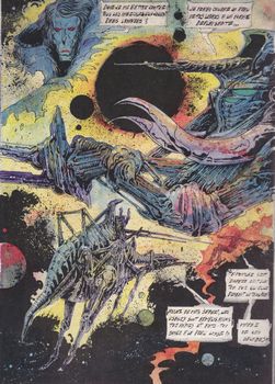 remarques: | Gaïl, la planète géante des mercenaires, rénégats de la Galaxie, gouvernée par Iriam Merennen, maître de Gaïl, ennemi de Shaan, maître de la Galaxie = les puissants, entités du monde intérieur Sainte-Marie des Anges = bagne galactique où l'on recrute les guerriers parmi les forçats, deux choix pour ceux-ci: ou devenir mercenaire ou devenir zombie décervelé >> p. 15/16 Sainte-Marie-des-Anges le forçat Toussaint, alias Lone Sloane, arrivé on ne sait comment sur ce bagne et devenu amnésique; des entités du monde extérieur = les dieux noirs, les forces du mal réveillent le subconscient de Sloane et le laisse organiser une révolte générale sur Ste-Marie-des-Anges, ceci afin que Shaan et Merennent s'entre-tuent pour le contrôle des révoltés du bagne Sloane en profite pour s'échapper, pourchassé par les façes blanches de Merennen, il réussit à s'en débarrasser et à se libérer de l'emprise des forces du mal et sur son vaisseau, il part à la recherche de Yearl le martien >> une orgie de dessins et de couleurs, un graphisme toujours aussi sublime, mais un scénario quelque peu obscure, la suite probablement des six voyages avec quelque information sur les origines de Lone Sloane |