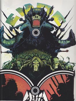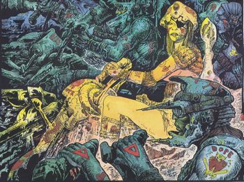 remarques: | album dédié à Nicole, femme de Druillet, morte d'un cancer, critique de la vie et de la médecine par Druillet aventures du gang des lions = Frankie, Heintz et Léon >> p. 3 la bande à Frankie le gang des lions va tour à tour être confronté au gang des coeurs brûlés, des os de fer, des mains d'acier et à celui d'Anita, joli-joint >> p. 30 Anita joli-joint puis ce sera la course à la dope, au shoote et autres drogues contre l'armée des crânes (= les forces de l'ordre) pour s'emparer du dépôt bleu = le dépôt de la shoote qui conduira tout le monde au néant >> p. 52/53 le dépôt bleu >> la guerre des gangs dans un monde pourri; délire, mirage, passage où apparaissent nombre des personnages de Druillet, mais le texte et le graphisme sont moins recherchés avec le thème de la mort, de la haine et de la merde omniprésent |