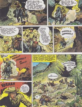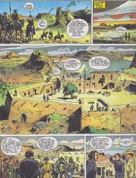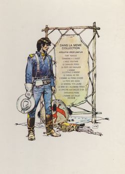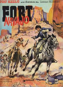 remarques: | la première aventure de Blueberry parue en 1963 dans Pilote, celui-ci est une réédition de 1965 soit 1er trimestre 1974, dernier titre l'homme qui valait 500'000 dollars biographie et commentaires sur Blueberry >> voir le titre Blueberry votre guide Arizona, 1865, le lieutenant Blueberry de la cavalerie US fête son incorporation à la garnison de Fort Navajo en gagnant son équipement au poker, rencontre avec le jeune lieutenant Craig fraîchement sorti de West Point et avec Muriel, la fille du commandant Dickson de fort Navajo sur la route du fort, découverte des ruines de la ferme Stanton qui a été attaquée par un parti de mescaleros pillards, Jim le jeune fils de Stanton a été enlevé par les mescaleros, aussitôt le courageux Craig décide de se lancer à la poursuite des indiens, suivi contre son gré par le lieutenant Blueberry, Craig tombe dans un piège apache, mais Blueberry réussit à l'en sortir grâce à la ruse du clairon faisant croire aux apaches que tout un escadron de tuniques bleues passent à l'attaque >> p. 10 le bétail massacré par les pillards chiricahuas selon Cochise, car de vrais apaches n'auraient pas massacré le bétail, mais l'auraient amené avec eux rencontre avec l'escadron du major Bascom et du lieutenant Crowe, (un sang mêlé = métis), Crowe est humilié par Bascom qui veut attaquer par représaille une bande d'apaches innocents, Blueberry sauve les apaches en sonnant à nouveau dans son clairon (mais cette fois en jouant la retraite au lieu de la charge) >> p. 28/29 l'altercation entre Bascom et Blueberry, puis entre Bascom et Craig >> p. 31 l'arrivée à Fort Navajo l'attaque manquée de Bascom a mis le feu aux poudres, Cochise prêche la révolte, mais essaie encore une dernière tentative, Dickson accepte de rencontrer Cochise mais entretemps, il est mordu par un crotale et perd connaissance, Bascom prend le commandement et tend un piège à Cochise qui grâce à Craig réussit à s'enfuir; cette fois c'est bien la guerre dans les territoires du Nevada, d'Arizona et du Nouveau-Mexique >> p. 42 à noter que le colonel s'est fait mordre dans des hautes herbes par un crotale, alors que les hommes de Bascom s'engagent sans botte dans les hautes herbes >> p. 48 la mine de l'allemand perdu est déjà mentionnée >> premier album de la série, le scénario est déjà très respectable bien que très connu (épisode historique avec Cochise), mais bien raconté par Charlier alors que le graphisme de Giraud en est à ses débuts, la couverture est de Jijé et restera la même pour toutes les rééditions n.b. pas encore de Mac Clure dans cet album, il n'apparaîtra qu'au tome 4 annexes - 1er et 4ème plat de l'album - page de garde - deux extraits de l'album |