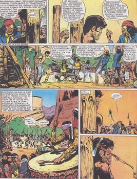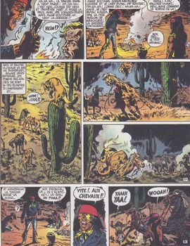 remarques: | Craig rapportant le message de Washington est capturé par les chefs apaches Nahtohé et Quanah, Blueberry, un sacré négotiateur, part à sa recherche >> p. 8 le supplice aux fourmis rouges pour Craig Blueberry réussit à récupérer Craig et le télégramme, en s'enfuyant, il parvient à brouiller leur piste et à arriver sain et sauf à camp Bowie avec Craig >> p. 11 Blueberry doté de tout un équipement (pelle, pioche, etc) >> p. 13 la nouvelle ruse de Blueberry qui bénéficie de beaucoup de miracles rencontre avec le vieux prospecteur Jimmy Mac Clure qui informe que Cochise s'est retiré avec ses guerriers au Mexique pour se ravitailler en armes et munition, Blueberry part avec Mac Clure afin de rencontrer Cochise et Crowe >> p. 15 apparition du fameux Mac Clure arrêtés par un parti apache, ceux-ci sont endormis par l'alcool truqué de Mac Clure, ils arrivent au camp apache de Charriba pour y rencontrer Crowe, mais c'est Quanah qui les attend >> p. 34 Double-face-au-nez-cassé (Blueberry) et Cou-de-cuir (Mac Clure) au poteau de torture (première mention du nom indien de Blueberry) ils seront sauvés in extremis par Crowe qui réussit à convaincre Charriba en lui rappelant qu'il lui a sauvé la vie à fort Navajo et que Blueberry avait plaidé leur cause Crowe, Blueberry et Mac Clure continuent leur voyage à la recherche de Cochise, première étape: Salinas, ville mexicaine >> p. 41 rencontre avec le capitaine sudiste Finlay (le jay-hawker, = soldat sudiste, mi-déserteur, mi-bandit, réfugié au Mexique après la guerre de Sécession) Blueberry bat Finlay au poker, mais est surpris par les compagnons de Finlay qui abandonnent Blueberry et ses amis aux mexicains d'Armendariz, Crowe réussit néanmoins (pas nez-cassé) à s'échapper et à convaincre Finlay de sauver la vie de Blueberry et de Mac Clure qui allaient être pendus >> p. 47 la fusillade mexicaine >> scénario bien soutenu et graphisme toujours de bonne qualité par Giraud, mais certaines pages sont signées par Jijé n.b. Giraud étant parti au Mexique, c'est Jijé qui dessinera la quasi moitié de l'album (mais peu de différence notable) |