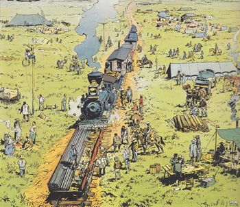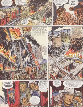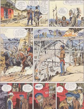 remarques: | 1868, construction du chemin de fer pour relier l'Atlantique au Pacifique, concurrence entre l'UP (Union Pacific) parti de l'est et entre le CP (Central Pacific) parti de l'ouest, on progresse d'environ 1 mile par jour, le général Dodge dirige l'Union Pacific qui commence à pénétrer sur les territoires indiens des sioux et cheyenne, Dodge fait alors appel à Blueberry pour négocier avec les indiens et envoie l'éclaireur "Red Neck" Wooley pour ramener Blueberry de Fort Navajo >> p. 6 les adieux de Blueberry en route pour le Wyoming (les Black Hills) = mille miles (env. 1600 km), les deux amis subissent une charge de bisons provoquée par des chasseurs peu réguliers faisant un massacre des bisons ce qui déclanche la fureur des sioux/cheyennes qui pourchassent tous les chasseurs dont celui de Mac Clure, mais leurs campements agressés, les peaux-rouges cessent leur attaque sur les chasseurs >> p. 11 la chasse aux bisons à l'explosif arrivé au camp de base de l'Union Pacific, Blueberry sauve la vie du chef cheyenne Deux Ours venu pour se plaindre des agressions effectués sur son peuple par des blancs, rencontre avec Jethro Diamond, dit Steelfingers, le manchot à la main artificielle en acier Dodge confie à Blueberry la sécurité du chemin de fer, mais déjà Blueberry soupçonne Steelfingers de provoquer les indiens pour retarder l'avance de l'Union Pacific au profit du Central Pacific, toutefois il ne sait pas que l'ingénieur Lewis, assistant de Dodge, les trahit aussi préparatifs de guerre par les chefs Sitting Bull et Red Cloud, confrontation entre Steelfingers et Blueberry au saloon Silver Spur, Blueberry est sauvé in extremis par l'intervention de Dodge, Steelfingers est arrêté et on découvre sur lui des pièces d'or californiennes >> p. 23 l'ambiance au Silver Spur saloon des négotiations sont engagés avec les chefs indiens au Thunder Creek Pass, mais Steelfingers réussit à s'évader et à faire échouer les négotiations, les indiens se sentent alors trahis par Blueberry et s'engagent définitivement sur le sentier de la guerre Blueberry rejoint le train engagé sur le chantier au point extrême de la voie et réussit à regagner le camp de base en franchissant in extremis le pont en feu de Garsdale >> p. 41 l'embuscade de la Thunder Creek Pass >> p. 47/48 la fuite en locomotive sur le pont de bois en feu >> le début d'un cycle excellent avec un scénario très bien développé, le lettrage est toutefois quelque peu difficile à lire, mais le graphisme est hors pair avec de superbes planches et une magnifique couverture d'album |
