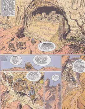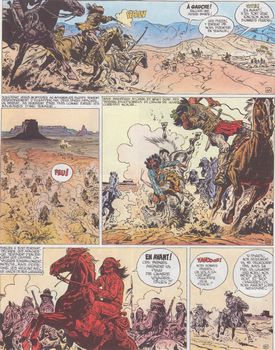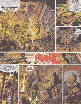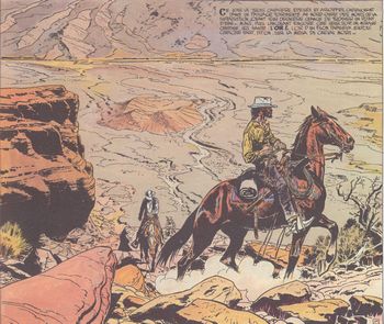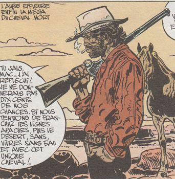remarques: | échappés au piège de Luckner près du point d'eau de la mesa du cheval mort, les 4 hommes doivent faire façe à une attaque des apaches >> p. 3 une planche avec de jolies perspectives tout en s'enfuyant, Wally abat le cheval de Blueberry qui reste à la merci des apaches, Mac Clure réussit à le prendre en croupe et tous deux se réfugient dans la mesa sacrée que les apaches n'osent pas pénétrer à cause des mauvais esprits >> p. 7/8 l'attaque des apaches après une petite pause, Blueberry et Mac Clure se remettent sur la trace de Luckner et de Wally >> p. 12 première manifestation du spectre >> p. 13 la célèbre vignette avec Blueberry (en bas à gauche) Wally et Luckner arrivent près de la grande dune de sable mouvant et préparent un piège à leurs poursuivants, tandis que Luckner en profite pour capturer vivant un dangereux crotale >> p. 16 la grande dune de sable mortelle lors d'une échaffourée avec le spectre, Luckner réussit à se débarrasser de Wally en lui glissant le crotale dans une de ses bottes, dépourvu de tout soin médical, Wally ne tarde pas à perdre la vie malgré l'arrivée de Blueberry et Mac Clure >> p. 21 apparition du spectre aux balles d'or >> p. 26 le spectre >> p. 28 le coup du crotale continuant la poursuite, on arrive à un ancien pueblo navajo où Luckner, arrivé le premier, se fait enfermer dans une kiwa par le spectre, mais malin comme un singe, il arrive à blesser le spectre aux balles d'or qui doit se réfugier dans sa retraite = la mine d'or de l'allemand perdu >> p. 32 Blueberry enterre toujours les morts qu'il rencontre >> p. 33 l'ancien village pueblo et où tout le monde suit tout le monde >> p. 34 la soif pour les hommes, mais quand est-il pour les chevaux? >> p. 40 le piège de la kiwa arrivés sur les lieux, Blueberry et Mac Clure suivent les traces de sang laissées par le spectre blessé et le retrouvent dans son repaire, la vraie histoire du baron Werner Amadeus von Luckner et de son domestique assassin Gustaaf Hazel, mais Prosit a réussi à s'évader de la kiwa, il enferme Blueberry, Mac Clure et le baron agonisant dans la mine, puis fait sauter le pueblo à l'explosif ensevelissant ainsi ses poursuivants et après avoir quitté le pueblo chargé d'or et avoir miraculeusement échappé aux apaches, Gustaaf mène la grande vie et va s'embarquer pour l'Europe quand il est arrêté par Blueberry et Mac Clure, rescapés aussi par miracle du pueblo en utilisant une sortie secrète et Gustaaf recevra une bonne corde de chanvre comme récompense >> un des meilleurs albums de la série, un graphisme grandiose et de toute beauté avec des perspectives sublimes sans oublier le scénario de Charlier qui est absolument étourdisant la piste de l'or = une piste dangereuse et sanglante un album cette fois de 54 Pages (au lieu de 48) pour finir en apothéose et en or ce cycle en deux albums annexes - couverture de l'album - une page de perspective - 2 extraits de page - l'image culte de Blueberry (p. 9) |