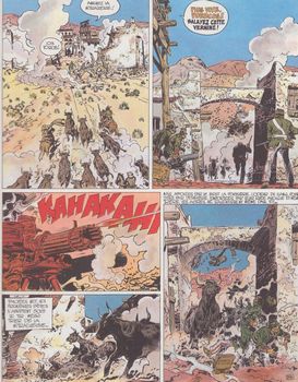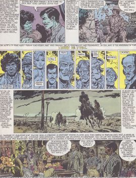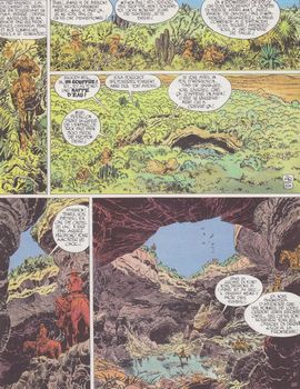 remarques: | bonne présentation du résumé de l'album précédent avec la liste des personnages de la série les recherches de Vigo mettent la puce à l'oreille du gouverneur Lopez, l'espion de Lopez, l'escamoteur Boudini, l'avise de l'arrivée de Mac Clure et Red Neck ainsi que de la bande de Finlay à Chihuahua et Blueberry près de Corvado est capturé par les hommes de Lopez, mais Mac Clure et Red Neck font temporairement alliance avec Finlay pour libérer Blueberry >> p. 12 le supplice de Blueberry (crotale et aqua enchilada) Blueberry est sauvé in extremis par l'intervention de Chihuahua Pearl qui promet de marier Lopez contre la libération de Blueberry, celui-ci est gardé prisonnier et cherche à retrouver Trevor alias Lindsay, espionné par le gouverneur, Blueberry réussit à rencontrer Trevor et imagine avec un autre détenu un plan pour s'évader, mais il est trahi par le détenu Reagan, lui et Trevor retombent aux mains de Lopez qui va les torturer pour savoir où se trouve le trésor entretemps Mac Clure et ses amis ont aussi imaginé un plan pour attaquer le fort et libérer Blueberry et Trevor alors que Lopez est absent pour organiser son mariage avec Chihuahua Pearl >> p. 34/35 l'attaque du fort à l'explosif et avec les toros Blueberry et Trevor sont délivrés et Trevor apprend à Blueberry qu'il est déjà marié avec Chihuahua Pearl, mais qu'il n'a pas voulu lui livrer le secret du trésor, c'est pourquoi Chihuahua Pearl a inventé la lettre au président US afin de forcer les évènements entretemps, Chihuahua Pearl a échappé au mariage avec Lopez en le menacant d'un derringer et en le prenant comme otage et tout le monde se retrouve dans une caverne (un aven) dissimulé dans un massif d'épineux >> p. 44 un aven (cratère naturel) inexpugnable toutefois Finlay prend Trevor en otage et le somme de le conduire au trésor contre la libération de Blueberry, Chihuahua Pearl et compagnie qui sont toutefois abandonnés sans armes et sans chevaux dans l'aven, mais avant de partir Trevor réussit à communiquer à Chihuahua Pearl que si il lui arrive quelque chose, elle doit chercher dans sa botte gauche >> p. 47 les belles retrouvailles >> un graphisme tout à fait respectable (surtout en fin d'album) et un scénario du diable (c'est la grande évasion) |