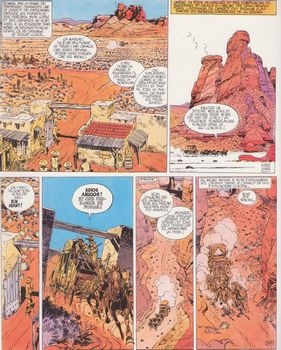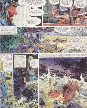 remarques: | album de 80 pages réparti en deux sections: a) l'épopée de Blueberry by Charlier biographie et documentation sur Bluebarry qui débute ses aventures en 1867 par une carrière militaire au 7ème de cavalerie US ainsi que développement de ses aventures jusqu'au spectre aux balles d'or avec quelques bonnes illustrations d'époque >> p. 7 Blueberry aurait même été conseiller militaire du chef Joseph des Nez-Percés dans ses péripéties pour parvenir à la frontière canadienne né en 1843, Blueberry de son vrai nom Mike Steve Donovan, serait mort à 90 ans en 1933, né au domaine de Red Wood Grove en Georgie, sa mère Cynthia meurt à la naissance de Blueberry, il restera dans la plantation de son père, Slim Phips Donovan, mais au début de la guerre de Sécession en 1861, Blueberry est mêlé à un assassinat du père de sa fiancée Harriet Tucker dont il est accusé, il rejoindra les lignes nordistes et après avoir servi sous les généraux Sheridan, Sherman et Dodge, il sera muté à Fort Navajo en 1867 >> p. 17 l'origine du nez cassé de Blueberry lors de l'évasion du général Dodge à noter que Blueberry est un personnage fiction imaginé par le scénariste Charlier et la biographie ci-dessus est tout autant fictive, toutefois bien documentée avec des photos d'époque, ces aventures sont illustrées dans la collection "Jeunesse de Blueberry" b) ballade pour un cercueil Trevor et Finlay atteignent Tacoma tandis que Blueberry et ses amis se morfondent dans l'aven au cimetière de Tacoman, Finlay déterre le cercueil qui ne contient qu'un cadavre et pas une once d'or, Trevor en profite pour prendre la fuite, mais son cheval abattu, il se barricade dans une maison où il est assassiné par un vagabond mexicain (Lazarito) qui réussit à prendre le large avec les chevaux de Finley et sa bande >> p. 25 l'évasion de Trevor et sa mort dans leur repaire, le groupe de Blueberry sont dénichés par les hommes de Lopez, ils réussiront toutefois à s'échapper par une sortie secrète et après s'être emparés des chevaux de Lopez par surprise, ils rencontrent Lazarito qui est démasqué par Chihuahua Pearl grâce aux bottes de Trevor, Pearl trouve alors le message dans la botte gauche de Trevor: la tombe d'Arturo Leyba le groupe arrive à son tour à Tacoma, enterrement de Trevor et une bonne gifle à Chihuahua Pearl par Blueberry pour avoir manqué de respect envers feu son mari la tombe de Leyba est trouvé dans l'église de Tacoma où l'on découvre un coffre blindé, Blueberry part à la recherche d'un chariot en laissant Pearl à Tacoma qui aussitôt se fait assiéger par la bande de Finlay restée dans les environs de Tacoma >> p. 34 la fameuse gifle de Blueberry à Chihuahua Pearl (ce serait de la brutalité si c'était une faible femme sans défense dixit Mac Clure) entretemps les mexicains de Lopez retrouvent la trace de Blueberry qui déniche le chariot du dr Hyéronimus pour transporter le coffre, bagarre avec les troupes mexicaines arrivées entretemps grâce aux explosifs, armes bien-aimées de nos héros >> p. 48/49 le feu d'artifice dans l'église de Tacoma en fuite sur la piste de Presidio, nouvelle confrontation au relais d'Herrera et Lopez et ses mexicains seront définitivement éliminés au pont du Conchos, mais il faudra encore compter avec la troupe de Vigo et arrivés au bac de Cayame, Blueberry et ses amis seront aussi en prise avec la bande de Finlay qui les attend sur l'autre côté > p. 59 la fuite en diligence le bac part à la dérive et s'échoue sur la rive américaine du Rio Grande, en route pour Salinas chercher du secours, Blueberry tombe sur la bande de Finlay, mais en est délivré par le chasseur de primes Abe Donnogan dont Blueberry se débarrassera peu après >> p. 69 Blueberry en tenue légère (caleçon) toutefois entretemps Finlay a découvert la cachette des amis de Blueberry, Blueberry intervient à temps après que Finlay ait fait ouvrir le coffre qui ne contient que de la ferraille par dépit Kimball le partenaire de Finlay abat celui-ci qui ne l'avait pas informé de l'amnistie arrangée par Blueberry >> p. 75 la mort de Finlay le groupe se sépare, Mac Clure et Red Neck prennent leur propre chemin et Chihuahua Pearl reprend ses anciennes activités, tandis que Blueberry oblige Vigo à l'accompagner à fort Davis pour témoigner en sa faveur que le coffre ne contenait pas le trésor recherché, mais Vigo trahit Blueberry et l'accuse même d'avoir volé l'or des confédérés, Blueberry est reconnu coupable et condamné à 30 ans de détention au pénitencier de Francisville >> p. 78 la trahison de Vigo >> une très bonne épopée mexicaine de Blueberry en une soixantaine de pages, un super album au graphisme de toute beauté (traits et couleurs) et à nouveau surtout un scénario du tonnerre avec de l'action rebondissant de page en page (une poursuite infernale et interminable) Annexes - couverture de l'album - Blueberry en tenue d'époque - extraits de l'album |