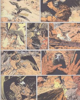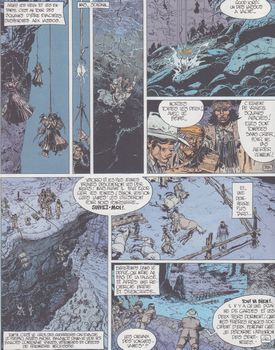 remarques: | début d'une nouvelle série de Blueberry à nouveau défenseur des indiens, toutefois le temps passé entretemps reste toutefois un mystère, pas de mention sur Angel Face ni sur Blueberry qui est supposé mort à la fin de l'album Angel Face, toutefois petite explication en page 14 après son accident avec la locomotive, Blueberry a été recueilli par les navajos de Cochise qui se trouvaient dans les environs >> p. 2 Apache Pass, le défilé le plus meurtrier de l'histoire de l'ouest Tolson, agent aux affaires indiennes et son acolyte Clyde tuent les navajos au tire-pipe, le commandant de Fort Bowie essaie de les en empêcher, mais les territoires des navajos sont convoités pour leurs filons d'or et d'argent par des politiciens verreux à Washington qui soutiennent Tolson la diligence pour Fort Bowie avec le célèbre "Wild Bill Hicock" est attaquée et utilisée par les navajos pour investir le trading post de Fort Bowie dirigé par Tolson, cette expédition punitive est conduite par Tsi-na-Pah = Nez Cassé (Blueberry) et le chef de guerre Vittorio, Tolson et Clyde sont obligés de boire l'alcool livré aux navajos et ils en meurent >> p. 7 Wild Bill Hickock est quelque peu caricaturé par Charlier >> p. 13 le chapeau à la mode pour Chini de la part de Tsi-na-Pah le lieutenant Bunch de Fort Bowie part à la recherche de sa femme Thelma qui était dans la diligence >> p. 14 l'histoire de Blueberry recherché par Wild Bill Hicock et comment Blueberry aurait a survécu à la catastrophe de la locomotive Cochise fait confiance à Tsi-na-Pah, mais celui-ci pour prouver son courage aux jeunes de la tribu accepte de capturer un aigle royal avec ses mains nues entretemps à fort Bowie, Bill Hicock fait venir Gédéon O'Bannion, dit Eggskull, chasseur d'indiens avec ses deux enfants: les dogues Gog et Magog, spécialemment dressés pour chasser l'indien >> p. 18 l'apparition de Eggskull et ses deux enfants >> p. 22 la lutte de Tsi-na-Pah contre l'aigle royal pour concurrencer Tsi-na-Pah et pour aussi prouver son courage, Vittorio décide de faire seul un raid sur Fort Bowie, malheureusement il se fait surprendre par les chiens de Eggskull et est fait prisonnier, mais pour retrouver les navajos, Bill Hicock fait évader Vittorio pour que ses traces mènent l'armée aux navajos, le camp de Cochise est découvert par l'armée, mais Tsi-na-Pah de retour détecte également les soldats de Fort Bowie et réussit à avertir Cochise s'en suit alors l'évasion de la tribu encerclée par l'armée en utilisant des cordes pour descendre une falaise abrupte et s'emparer des chevaux de l'armée (une autre ruse de Blueberry) >> p. 35 la fuite du pueblo Tsi-na-Pah conseille à Cochise de fuir vers le Mexique pour se mettre à l'abri, mais profitant d'une défaillance de Cochise, Vittorio donne l'ordre à ses guerriers d'attaquer Fort Bowie pendant que l'armée à pied mettra un bon bout de temps pour rejoindre le fort, Tsi-na-Pah s'y oppose, toutefois en cherchant avec Chini à arrêter l'attaque de Vittorio, il tombe sur Eggskull qui blesse gravement Chini, Tsi-na-Pah réussira toutefois à empêcher l'offensive de Vittorio et à confier Chini au bon soin du docteur du fort tout en restant prisonnier de la garnison >> graphisme toujours bon (trait fin et détaillé) et le scénario de Charlier reste toujours passionnant, Blueberry redevient le défenseur des indiens et apparition de nombreux nouveaux caractères: Chini, Vittorio, Eggskull, Bill Hicock mais absence de Mac Clure et Red Neck dans cet épisode |