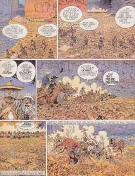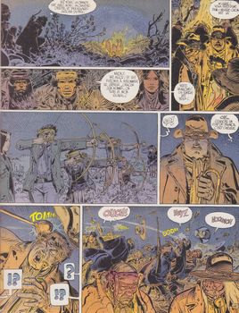 remarques: | à la réserve de San Carlos, la tribu de Cochise vit dans des conditions lamentables mourant de froid et de faim, surveillée par le major Rudensky, commandant du fort de San Carlos alors que Blueberry a rejoint Cochise, mais il est talonné par l'escadron de Miller qui a averti le fort de San Carlos de l'arrivée de Blueberry et des guerriers navajos, entretemps le général Miller s'établit à Pima d'où il verrouille avec ses troupes trois routes vers le sud à travers la sierra >> p. 10 mais Tsi-na-Pah a plus d'un tour dans son sac Blueberry organise magnifiquement l'évasion de la tribu de Cochise et réussit même à intercepter un messager de San Carlos et à établir un faux télégraphe destiné au général Miller l'informant que les navajos ont pris un itinéraire vers le sud pour rejoindre le Mexique de son côté Blueberry envoie Mac Clure et Red Neck se procurer du ravitaillement pour les navajos en route vers le sud-est, malheureusement ceux-ci se font déjà débusquer par Eggskull qui a trouvé un nouvel enfant avec le mastiff Baal et qui suit les traces de Mac Clure et Red Neck pour rejoindre la tribu >> p. 34 le beau rêve de Mac Clure entretemps, trompé par le faux message, le général Miller avec sa troupe a quitté Pima pour le sud-ouest afin de rejoindre un autre escadron et encercler les navajos qui profitant de l'aubaine traversent les environs de Pima en se dirigeant vers le sud-est et le Mexique entretemps Eggskull a retrouvé la tribu et averti Bill Hickock qui patrouille avec sa bande sur la ligne de chemin de fer, ceux-ci préparent une embuscade aux navajos qui s'appprêtent à franchir la voie de chemin de fer Tsi-na-Pah, toujours aussi malin, a vent de l'affaire et prépare un nouveau piège aux hommes de Bill Hicock, Cochise et les vieillards de la tribu se sacrifiant pour attirer les hommes de Bill Hicock vers eux pendant que le reste de la tribu traverse la voie et rejoint les contreforts de Cedar Moutains où se trouve la frontière avec le Mexique >> p. 44 la mort de Cochise Bill Hicock et ses hommes se rendent bientôt compte qu'ils ont été trompés et dans une terrible cavalcade retournent sur les traces des navajos, maintenant bien engagés dans le défilé des Cedar Mountains où Blueberry leur a préparé une terrible embuscade, les hommes de Bill Hicock doivent se replier et Eggskull meurt dans l'action >> p. 46/47 pas d'attaque de train cette fois, mais une fameuse embuscade à nouveau à l'explosif arrangée par l'artificier Mac Clure >> p. 48 la mort d'Eggskull et on n'entendra plus parler de Wild Bill Hicock, la tribu en sûreté au Mexique, Blueberry part maintenant à la recherche de Vigo pour prouver son innocence, laissant Chini à la garde de Vittorio >> toujours une bonne continuation, graphisme bien exécuté et scénario bien imaginé par Charlier, dernier épisode de Blueberry, alias Tsi-na-Pah, défenseur des indiens |
