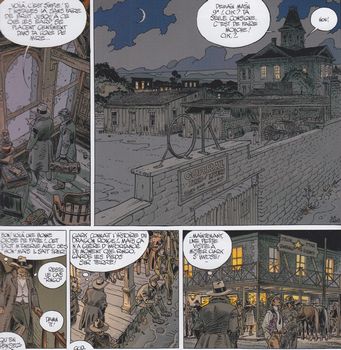 remarques: | l'attentat de OK Corral est préparé par Strawfield qui a réuni une équipe de tueurs attitrés représentant la crème de la crapulerie: - Heinrich = le loup dans la bergerie, Hon-le-muet, Don Clark et Johnny Ringo, le tueur-fou >> p. 3 la Silver Lucky Hand = la mine d'argent de Strawfield John Clum est abattu par Ringo, mais Clum réussit à atteindre Tombstone et à avertir Dorée Malone avant d'être égorgé, toutefois Dorée est enlevée peu après avant d'avoir pu avertir Wyatt Earp Blueberry reprend alors du service pour retrouver Dorée, tandis que Hemrich sous le déguisement d'un sherif suppléant s'intègre dans le groupe de Wyatt Earp >> p. 13 la face de Hemrich, le faux sherif les Clanton se rendent au rendez-vous de OK Corral, Blueberry réussit à éliminer Don Clark puis Hon-le-muet (qui n'est pas vraiment muet et qui lui révèle avant de mourir le repaire de Ringo: la chambre numéro 13 >> p. 20 l'installation de Don Clark >> p. 38 duel au Dunhill Saloon >> p. 43 le supplice de Dorée par Ringo, le chaman blanc Tombstone, Ok Corral, 8 heures du matin, la rencontre entre les Earp et les Clanton se prépare, son piège diabolique achevé, Strawfield quitte Tombstone, mais il est déjà repéré par les apaches de Geronimo qui viennent d'éliminer Ma Clanton, Heinrich s'est mis en place et Blueberry est sur le point de surprendre Ringo le dernier acte va se jouer dans le prochain album intitulé "Dust" >> la série reprend du poil à la bête, le scénario est bon et bien ficelé, avec un graphisme sombre tout comme le scénario, un album peut'être pour faire durer le plaisir, mais l'attente du dernier acte est bien combinée et on attend avec impatience le dénouement n.b. on a toujours terriblement soif dans les aventures de Blueberry à Tombstone et c'est aussi une cascade de meurtres et de cadavres dont plusieurs fois avec un Blueberry touché et ressuscité Information - la fusillade d'O.K. Corral est un affrontement qui s'est déroulé le mercredi 26 octobre 1881 dans la ville de Tombstone en Arizona entre les shérifs Earp Wyatt, Virgil + Morgan Earp ainsi que leur ami Doc Holliday contre les frères Ike et Billy Clanton avec leurs alliés les frères Tom et Frank McLaury le combat se termina aussi vite qu'il avait commencé, Billy Clanton, Tom et Frank McLaury moururent en quelques instants, Ike Clanton échappa à la mort, du côté des Earps, deux frères furent blessés mais Wyatt et Doc en sortirent indemnes n.b. Giraud mentionne un frère Wyatt nommé Simon, mais il s'agit en fait de Morgan Wyatt décédé dans le duel en 1877, un ancien éclaireur de l'armée, Ed Schiffelin, découvrit un filon d'argent et baptisa ironiquement sa trouvaille Tombstone qui devint le nom d'une ville près du site O.K. Corral (pour Old Kindersley Corral and Livery) était une écurie de louage (livery yard) et un corral pour chevaux qui a existé de 1879 à environ 1888 dans la ville minière de Tombstone, corral était un enclos destiné à recevoir des animaux d'élevage, généralement avant leur envoi vers les abattoirs, O.K. Corral a donné lieu à différentes oeuvres inspirées de cette fusillade (bandes dessinées, cinéma, etc) |