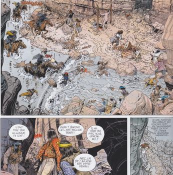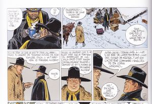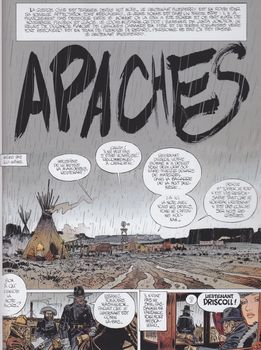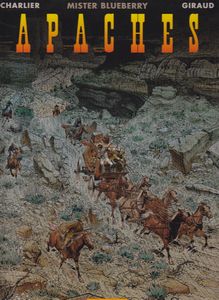 remarques: | album HS (hors-série) de 64 pages Apaches est une réécriture de l'histoire en flash-back sur Blueberry et Geronimo faite à partir des pages parues dans les albums ombres sur Tombstone, Geronimo l'apache et Dust, ce récit comprend aussi quelques images et textes inédits dans les albums de la série Mister Blueberry mais il manque 5 vignettes (voir annexe) c'est le tout dernier album de Blueberry, publié hors série description de Blueberry lors de la fin de la guerre de Sécession depuis Fort Mescalero jusqu'à son arrivée à Fort Navajo vers cette nouvelle frontière à conquérir sur les Indiens ce fut le cycle de Tombstone avec l'histoire de Geronimo en flash-back et OK Corral comme thème principal ainsi que les frères Earp et Blueberry en second plan et au début de l'histoire avec Geronimo, Blueberry n'apparaît pas sous son meilleur jour >> p. 4 dessoulé avec les cochons n.b. pour le résumé de l'histoire avec Geronimo >> voir les 3 albums sus-mentionnés de la série - tome 25, pages 25-30 et 34-42 - tome 26, pages 14-20 et 29-32 - tome 28, pages 32-34, 42-53 et 56-66 - ce HS apaches reprend les pages ci-dessus avec toutefois quelques vignettes en plus (tel p. 9/10), quelques autres légers changements y compris pour la couleur et une fin inédite pour Blueberry qui quitte for Mescalero pour prendre son nouveau poste à fort Navajo à noter: - p. 9/10 4 vignettes supplémentaires - p. 25/26 3 " " - p. 30 6 " " - p. 31 7 " " - p. 35 texte différent mais mêmes vignettes - p. 37 2 " " - p. 51 >> il manque 5 vignettes - p. 62 1 " " - p. 63/64 2 planches supplémentaires pour finir l'album et où Blueberry devient sobre, reste un défenseur des indiens et part pour Fort Navajo >> un album édité sans grandes raisons sauf financières, car l'épisode de Geronimo s'intégrait plutôt bien dans la série Mister Blueberry/Tombstone et les quelques vignettes ajoutées ne sont vraiment pas d'une grande originalité pour justifier un album à part, toutefois une jolie couverture d'album n.b. l'album ne reprend que l'épisode de Blueberry avec Geronimo avant la dictée de ses aventures à Campbell Information les deux journalistes John Meredith Campbell (avec les mêmes initiales que Charlier) et son assistant Billy Parker sont des personnages fictifs dans ces aventures de Blueberry |