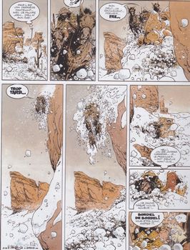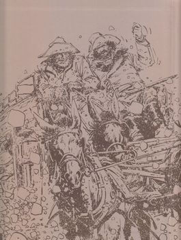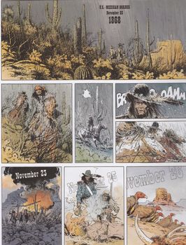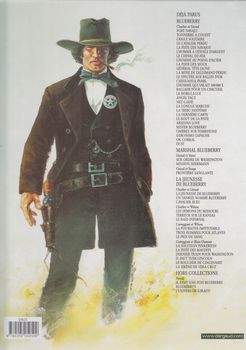 remarques: | prélude: après son combat héroïque dans les collines noires (BlackHills) contre les sioux, avant que la vengeance du général tête jaune ne l'envoie croupir dans la petite ville frontière de Palomito, Blueberry a repris ses fonctions dans la garnison du légendaire fort Navajo 1868, Fort Navajo sous la neige et sous l'autorité du colonel Tom Clark, une bande de dissidents apaches menés par Chato sèment la terreur dans la région alors que Blueberry négocie avec le chef des apaches Ay-Quah et qu'un envoyé de Washington se fait canarder dans la diligence qui l'amène à Fort Navajo >> p. 11 la pensée du vieux philosophe apache: à quoi sert la sagesse dans un monde qui va vers la folie >> p. 13 la chute précipitée de la diligence Blueberry sur le chemin du retour avec Chato comme prisonnier tombe avec son groupe sur la diligence abandonnée, l'envoyé a disparu et Blueberry part seul à sa recherche Blueberry constate que l'attaque de la diligence n'est pas l'oeuvre des apaches, il s'agit d'un tueur à gage (Newman) qui s'est servi d'un fusil Sharps (= fusil spécial pour la chasse aux bisons) et qui a reçu l'ordre d'éliminer l'envoyé et par la même occasion Blueberry entretemps, Blueberry a retrouvé l'envoyé de Washington qui lui apprend qu'il reçu des instructions du général Sherman donnant l'ordre à Blueberry de démantibuler un trafic d'armes vers le Mexique, au même moment fort Navajo est attaqué par les dissidents de Chato qui veulent libérer leur chef ramené au fort par les soldats de Blueberry, mais arrivé peu après, grâce à un souterrain et à nouveau avec l'aide d'explosifs (cela devient une habitude avec Blueberry), Blueberry ramènera l'ordre et la paix à Fort Navajo >> p. 43 Blueberry l'indestructible Chato est tué durant les combats, mais le criminel Newman a réussi à s'enfuir et Blueberry qui a été nommé Marshal par Sherman (sur l'ordre de Washington) part à la poursuite de Newman >> si le graphisme de Vance est tout-à-fait respectable, il n'en est pas de même pour le texte de Giraud qui est plutôt faible, un petit début pour cette nouvelle série spin-off annexes - couverture 1er plat - page de garde - couverture 4ème plat - 2 pages extraites de l'album |