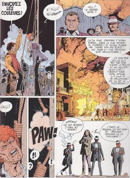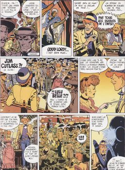 remarques: | la suite des aventures plus très fameuses de Jim Cutlass, dessinateur: Rossi et scénariste: Giraud Cyprus Lodge est en pleine expansion mais la récolte de coton est incendiée par le Ku Klux Klan à la solde de Playcard et de Don Clay mystérieusement ressuscité >> p. 7 l'histoire du Ku Klux Klan, ainsi désigné parce que ce nom imite le bruit d'un fusil qu'on arme Cutlass est envoyé par Sherman pour enquêter sur les méfaits du Ku Klux Klan, il retrouve la piste des meneurs mais inexplicablement, il ne cherche pas à les arrêter, il marque une pause pour trouver des preuves irrefutables (la suite dans le prochain album) >> p. 21 l'enquête chez les photographes dont un sacré cochon >> p. 33 les tribulations de Cutlass dans une chambre d'hôtel et son fameux juron "good lord" >> p. 58 les clés glissent à travers les doigts ensanglantés >> un pauvre album avec un scénario plutôt faible et un graphisme moyen, tout comme la série "Marshal Blueberry", la série Jim Cutlass a désormais du plomb dans l'aile |