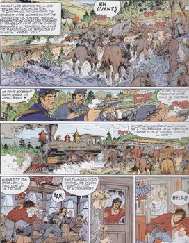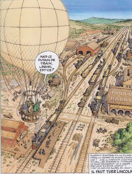 remarques: | avant d'attendre l'abandon d'Atlanta par Hood, Blueberry et ses amis s'évadent et visitent la tombe d'Eleonore Mitchell au cimetière de Butler Hill découvrant que la tombe est occupée par un autre cadavre que la sournoise Mitchell >> p. 17 la fuite en corbillard et Blueberry se remet sur la piste de Mitchell qui est à Washington où elle rencontre l'acteur de théâtre Booth avec qui elle prépare un attentat sur Lincoln, Blueberry se rend à Washington pour avertir Alan Pinkerton, le chef des services secrets nordistes qui lui semble être bien informé sur Mitchell, mais qui n'en laisse rien paraître et qui manipule Blueberry, tandis que Mitchell avec ses complices laissent toujours une piste sanglante derrière elle >> p. 22 rencontre Mitchell et Booth, le futur assassin de Lincoln >> p. 26/27 la réunion des frères de la secte du poignard de sang qui veulent éliminer le président Lincoln >> p. 30 Blueberry trahit par des pigeons >> p. 31 Blueberry retrouve Mitchell Blueberry est à nouveau capturé par celle-ci, les compagnons de Blueberry font alors alliance avec Pinkerton pour retrouver Blueberry et empêcher l'attentat sur Lincoln, à ce effet ils partent à la rencontre du train de Lincoln par aérostat (décidément Corteggiani aime les ballons volants) >> p. 40 "nous ne dormons jamais" = la devise de l'agence Pinkerton >> p. 41 on veut saigner Blueberry comme un cochon lors d'une attaque sudiste sur le train où se trouvent Mitchell et Blueberry prisonnier, celui-ci réussit à s'échapper pour tomber peu après aux mains des sudistes du général Jubal Early >> un album avec actions précipitées et avec Eleonore Mitchell qui ouvre le bal, pas de Bowman dans ce récit quand même assez bien combiné avec toujours un bon graphisme de Blanc-Dumont et une putain de jolie planche pour finir l'album |