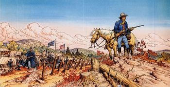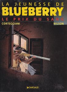 remarques: | album Dargaud numéroté 9 pour la jeunesse de Blueberry pages de garde neutre, 4ème plat noir et sans intérêt sauf pour la réédition de 2005 (voir album précédent) 1864, Georgie, Atlanta, toujours sur les traces de Bowman, Blueberry et son équipe traversent de nombreuses bourgades sudistes en éclaireurs de l'escadron Sherman et arrivent à la plantation de Miss Reynes et de sa brigade de soldates-amazones avec des canons bidons (= des troncs d'arbres évidés), celles-ci seront involontairement mêlées aux affaires de Blueberry, au moins cette fois il semble que Bowman soit définitivement éliminé mais allez savoir avec cette vermine... >> p. 9 rien n'arrête Blueberry (et son cheval) >> p. 21 les canons postiches >> p. 31 moralité sur la guerre >> p. 48 et Miss Reynes deviendra une des amoureuses de Blueberry >> le personnage de Blueberry a bien changé, le scénario est plutôt faible et n'apporte plus vraiment d'originalité, on suit la piste tracée et on cavale à tort et à travers avec un pauvre texte, tel que les nouveaux jurons " sodding hell" (mêlée à la sodomie) qui ne veulent plus dire grand chose et peu relevé: p. 25 où on va pisser comme si on allait boire un verre le titre de l'album aurait aussi pu être "à la recherche de Bowman", dernier album dessiné par Wilson qui n'est plus aussi soigné probablement non enthousiasmé par les scénarios de Corteggiani ce n'est plus le prix du sang, c'est le prix du Blueberry qui a beaucoup chuté annexes - couverture de l'album - une illustration à part de Blueberry (rien à voir avec l'album) - à la fin de l'album grand jeu-concours de Blueberry organisé par les éditions Dargaud |