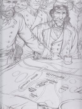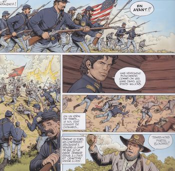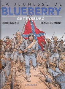 remarques: | les pages de garde (représentant le plan de la bataille de Gettysburg) changent pour ce dernier album de 56 pages et le premier plat en hommage à Giraud, décédé en 2012, se veut de représenter le premier plat du tome 1 de la Jeunesse de Blueberry début par une bataille finale de la guerre de Sécession durant laquelle Blueberry raconte à un compagnon ce que fut la bataille de Gettysburg >> p. 5 la roue d'Anacréon, poète grec 550 BC, une de ses citations: pareille à la roue d’un char, la vie précipite sa course, et dans la tombe il ne reste de nous qu’un peu de poussière >> p. 11 un nouveau juron "by the hell" >> p. 12/13 Blueberry se souvient bataille de Gettysburg du 1.7. au 3.7.1863 entre les généraux sudistes Lee, Longstreet et Pickett contre les généraux nordistes Chamberlain et Meade de l'armée du Potomac d'abord le traquenard nordiste à Devil's Den, puis les combats pour Little Round Top contrôlant le champ de bataille, enfin l'assaut frontal sudiste sur Big Round Top où les sudistes se font décimés par les nordistes installés sur Cemetary Ridge et Culp's Hill et qui prennent leurs adversaires en tenaille (ce sera Bloody Angle et l'erreur magistral de Lee contre l'avis de Longstreet qui voulait contourner les lignes nordistes) les sudistes sont vaincus, mais les nordistes ne peuvent pas exploiter leur victoire suite à de lourdes pertes et chaque partie se replie sur des lignes arrières, toutefois les sudistes devront encore traverser le Potomac avant de se réfugier en Virginie Gettysburg est restée comme l'une des batailles les plus célèbres de l'histoire américaine, mais ne termina pas la guerre de Sécession, toutefois cet album met fin à la légende de Blueberry, du moins dans sa jeunesse >> 20ème et dernier album de la série "Jeunesse de Blueberry", en tout cas dernier album collectionné malgré un prochain titre annoncé "l'antre du serpent" car c'est aussi le massacre de la légende de Blueberry en publiant vraiment de très faible récits dans les 5 derniers albums de ce cycle bien que Corteggiani veuille absolument continuer à démontrer ses connaissances sur la Guerre de Sécession n.b. il y aura encore en 2015 un 21ème et dernier album: le convoi des bannis (non collectionné ici) + en 2000 HS "carnet de route, les origines d'un mythe >>> voir l'album 11 de la jeunesse annexes - couverture de l'album - page de garde - extrait de l'album - couverture du dernier album 21 |