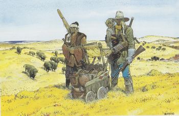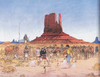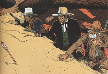 remarques: | album produit par Jean Giraud, Jean-Michel Charlier, Claudine Giraud et Franck Bruneau préface d'Eddy Mitchell n.b. celui-ci était un admirateur de Blueberry, peut'être aussi parce que Giraud avait repris la gueule de Mitchell pour certains personnages album à l'italienne présentant sur Blueberry de nombreuses illustrations, posters, affiches, couvertures d'album, aquarelles, peintures ainsi qu'une série inédite >> p. 59 "three black birds" >> p. 8 les chefs indiens >> p. 18/19 une très belle aquarelle (acrylique = produit de synthèse) >> p. 43 le colt de Blueberry >> p. 65 à 76 portraits de Blueberry >> album artistique reprenant plusieurs illustrations inédites, parfois fort belles, sur Blueberry, mais rien de beaucoup plus spécial que celles présentées dans l'album "le tireur solitaire" annexes - couverture de l'album - aquarelle acrylique - combat Blueberry-Quanah - le colt de Blueberry - poster promotion signé Moebius - le trio inséparable Information dossier Blueberry et les femmes célibataire endurci, Blueberry semble avoir un problème avec les femmes, pourtant, elles sont souvent présentes dans la série, avec des rôles plus ou moins importants, des personnalités plus ou moins marquées, mais Jean-Michel Charlier a souvent expliqué qu'à l'époque des premiers albums de Blueberry, dans les années 1960, un comité de censure veillait à ce que les personnages féminins de BD et les héros n'aient pas plus d'intimité qu'entre frères et sœurs dans Fort Navajo et les albums suivants du cycle, les deux seuls personnages féminins (la sœur et la fille du colonel Dickson) apparaissent comme très secondaires et conventionnels, dans l'homme à l'étoile d'argent, Katie Marsh a déjà un peu plus de consistance: décidée, ferme de caractère, un peu "garçon manqué", elle donne une leçon de courage aux hommes de Silver Creek, Blueberry la traite comme une gamine, paternaliste et moqueur: elle n'en tombe pas moins amoureuse de lui et déclare à la fin de l'album: Mike, je t'attendrai avec le cycle sur le trésor confédéré apparait le personnage féminin le plus remarquable de toute la série: Chihuahua Pearl qui occupe une position centrale dans l'histoire, aventurière décidée, intelligente et sans scrupule, sachant jouer des atouts de sa féminité, son objectif est de faire fortune à n'importe quel prix, elle est le seul amour de Blueberry qui pourtant la laissera partir pour épouser un riche homme d'affaires, c'est aussi ce personnage qui marque une révolution dans la série: à la page 22 de l'album Arizona love (paru en 1990) apparait le premier nu des aventures de Blueberry, Chihuahua Pearl vient de passer une nuit d'amour avec l'ex-lieutenant |