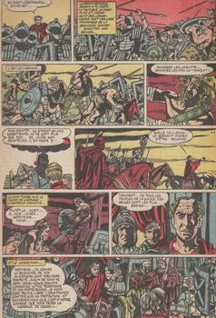 remarques: | album broché de 32 pages, 50% couleur, 50% N&B dessinateurs: Paape, Graton, Tacq, Attanasio et Dupuis scénaristes: Joliy et Goscinny préface sur les faits d'armes héroïques dans l'histoire: les hommes d'épopée (caractères et vertus), la Révolution Française rendue possible par le caractère faible de Louis XVI, Napoleon, un des plus grands hommes de l'histoire (code civil, code Napoleon) note: si le nez de Cléopâtre avait été plus court, la façe du monde s'en serait trouvée changée a) la mort de Roland, le modèle des héros, sous Charlemagne (778) - Attanasio/Joly b) Guillaume Tell (1291) la lutte pour la liberté - Attanasio/Joly c) Boduognat (57 B.C.) les guerres de César en Gaule et où la science militaire l'emporte sur le courage gaulois, mais "de tous les peuples de la Gaule, les belges sont les plus braves" - Paape/Joly d) Dollard des Ormeaux, commandant français au Canada (1660), le Léonidas canadien - Tacq/Joly e) De Lattre de Tassigny, maréchal de France (1940, mort en 1952) avec sa devise "ne pas subir" - Dupuis/Goscinny f) Trafalgar (1805) la victoire de l'amiral Horace Nelson qui sauva l'Angleterre de l'invasion, sa devise "England expects everybody to do his duty", mais aussi le surnom "un coup de Trafalgar" - Graton/Joly g) rien à signaler, mon général = paroles du général franquiste Moscardo durant le siège de l'Alcazar (1936) qui sacrifia son fils pour l'honneur - Tacq/Joly >> des récits assez intéressants avec un bon graphisme |