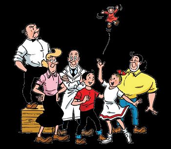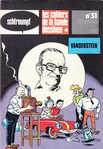 remarques: | 1) les années d'apprentissage by Thierry Groenstein Willebrord Jan Frans Maria Vandersteen, sujet flamand, né à Anvers 1913-1990), il sera le dessinateur le plus prolifique de la bande dessinée et un des piliers de la BD flamande avec Bob de Moor et Marc Sleen débute en 1941 dans la BD (Wil, avec Thor l'homme des cavernes, Pudifar, Barabitje inspiré de Mutt and Jeff), en 1943 il réalise la série Piwo, le petit cheval de bois travaille pour Bravo, Franc-Jeu (Bill et Sam, inspecteur Briket), puis ce sera Rikki en Wiske dans de Nieuwe Standaard, en 1945 rebaptisé Suske en Wiske (Francis et Louis par traduction) = Bob et Bobette, série qui le rendra célèbre (plus de 200 histoires parues) 2) entretiens avec Vandersteen by Thierry Groenstein travaille aussi pour le Journal Tintin qu'il quitte en 1959 pour l'éditeur Standaard et pour devenir indépendant, mais il garde contact avec ses collègues de Tintin lors des banquets à l'auberge du Chevalier à Beersel il garde l'esprit flamand dans ses histoires, fait les deux métiers: dessinateur et raconteur d'histoires, mais il excelle le plus dans les scénarios a été très influençé par Hergé et la ligne claire, a pu diversifier sa production grâce à la création de son studio dans les années 50 sa série principale: Bob et Bobette avec Lambique, Jérôme et Sidonie, aime particulièrement Lambique, Hergé nomma Vandersteen le "Brueghel de la BD" 3) Bob et Bobette ou la famille qui n'existe pas by Thierry Groenstein la série débute le 30.3.1945 dans le Nieuwe Standaard, étude des personnages: Bobette et sa poupée-fétiche Fanfreluche; Lambique héros typiquement belge, apparenté à Haddock, irremplaçable, conciliant tous les tares et vertus humaines et dont le nom est emprunté à la fameuse bière Gueuze-Lambik, Jérôme le surhomme, Sidonie l'autorité et Barabas le savant inventeur pas de liens familiaux, Bob n'est pas le frère de Bobette et Lambique n'est ni leur père ni leur oncle, les trois voyageant souvent dans leurs histoires grâce à l'appareil teletemps du prof. Barabas et grâce aussi à la magie et à l'hypnose le but de Vandersteen n'est pas d'être crédible mais d'amuser et l'oeuvre de Vandersteen est avant tout une oeuvre populaire n.b. pour entrer au Journal Tintin, Vandersteen a dû faire quelques concessions à Hergé: supprimer Sidonie et Jérôme et remplacer le chignon de Bobette par de jolies boucles blondes 4) une recette à la Flamande by Jean Lucas les meilleurs récits (8) de Bob et Bobette sont dessinés dans le Journal Tintin de 1949 à 1958 (280 titres parus aujourd'hui) n.b. alors que le fantôme espagnol est la première série de Bob et Bobette parue dans Tintin belge, ce sera la "clef de bronze" qui paraîtra en premier dans Tintin France 5) son altesse Riri by Didier Pasamonik - créé dans Tintin en 1953 pour boucher les trous du Journal, cette série fut une des premières BD à gags dans Tintin - le héros en est le prince Riri qui se moque complètement du pouvoir et de ses fonctions - un exemple parfait de la ligne claire et qui fait de Vandersteen un créateur à part dans l'histoire de la BD contemporaine 6) les oeuvres réalistes de Vandersteen by Jean-Marie Smits 1946-1950 - Het Veenspook (l'auberge abandonnée) - commando de Mars 1950 - Judi concernant l'histoire sainte - rencontre avec son plus proche collaborateur: Karel Verschuere 1951-1953 - 2 volumes de Thyl Ulenspiegel (Tjil Uilenspiegel) inspiré du livre de Charles de Coster avec Thyl, Nele et Lamme 1950 - Bessy dans "la libre Belgique", inspiré du chien colley Lassie, paraissant par la suite surtout pour un éditeur allemand 1959 - de rode ridder, époque moyenâgeuse avec Johan le chevalier rouge 1963 Karl May 1965 Biggles remplacé par Safari en 1969 1969 Safari = aventures africaines oeuvres de grande diversité rendues possibles par la création du studio Vandersteen, mais seuls les premiers albums de chaque série ont eu vraiment du succès, notamment ceux de Thyl Ulenspiegel, exception: les albums de Bessy 7) le studio Vandersteen by Thierry Groenstein comprend une vingtaine de collaborateurs dont - Karel Boumans, né en 1931 - Karel Verschuere né en 1924 (Judi, Bessy) - Edouard de Rop né en 1928 (Bob et Bobette) >> p. 38 la naissance d'un strip: crayonné, crayonné poussé, encrage, couleur 8) Bibliographie 1943 dans Ons Volk (Piwo, le petit cheval de bois) 1944-45 dans Franc Jeu (Briket, Tommy) 1944-46 dans Bravo (Sindbad le marin, Lancelot) 1947 dans le Petit Monde (masque rouge, Poppy et Maggy, commando de Mars) 1948-1953 dans Tintin 1948-1959 (Monsieur Lambique, Bob et Bobette = 8 récits dans la collection bleue (fantôme espagnol, clef de bronze, casque tartare, trésor Beersel, gladiateur mystère, martiens sont là) masques blancs et cavale d'or dans la collection rouge Erasme 1951-1953 (Thyl Ulenspiegel) 1951-1959 (son altesse Riri) albums édition Erasme dès 1958: - cirque Zim Boum - les joyeux lurons - la famille Guignon (Snoek) - Bessy = env. 150 albums dont le premier "les pionniers" - Robert et Bertrand - Jérôme - Neron - Bob et Bobette = env. 240 albums >> un cahier CBD comme on les aime: ligne claire, simple et concret, à part pour les illustrations, ce cahier est d'aussi bonne qualité que le livre biographique sur Vandersteen (publié par Standaard en 1994) |