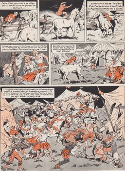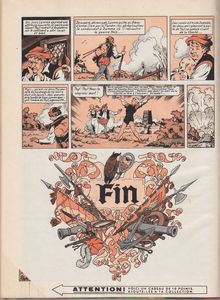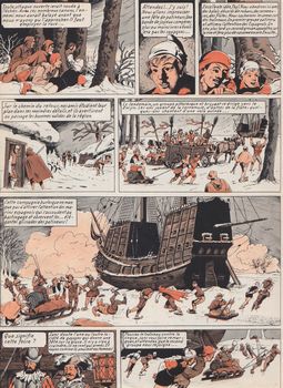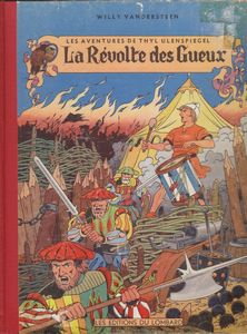 remarques: | album cartonné Lombard (France), 68 pages, édition Van Cortenbergh, impression helio-offset (genre lavis), 4ème plat "peau d'ours", 8 titres, dernier titre: révolte des gueux un des premiers albums Lombard avec Blake+Mortimer, Alix, Corentin et le fantôme espagnol dont le récit d'ailleurs se déroule dans la même période que la révolte des gueux aventures à Damme en pays flamand (1562) sous l'occupation espagnole dirigée par Fernando Alvarez de Tolède, 3ème duc d'Albe, tandis que la résistance flamande s'organise sous la bannière de Guillaume de Nassau, prince d'Orange, dit le Taciturne (= qui parle peu) avec ses devises "je maintiendrai" et "point n'est besoin d'espérer pour entreprendre ni de réussir pour persévérer" les personnages: - Thyl, fils de Claes le charbonnier et de Soetkin - Nele, fille de Katheline, la magicienne - Lamme Goedzak, compagnon de Thyl - Hans le gueux, ami de Katheline - Guillaume d'Orange - le bailli de Damme (qui deviendra loup-garou) - Riesenkraft, le lansquenet suisse n.b. Thyl est l'esprit de la Flandre, Nele est son coeur et Lamme son estomac démêlés avec le bailli qui veut s'approprier les ducats d'or destinés à financer l'armée de Guillaume d'Orange, Thyl et ses amis parviennent à rejoindre les troupes de Guillaume, mais les parents de Thyl perdent la vie durant le trajet >> p. 17 l'épisode avec la ruche vide et les trois aveugles-espions auprès d'Orange, Thyl déjoue un attentat sur le prince >> p. 24 l'assaut manqué du commandant Romero sur le camp flamand par la suite, Thyl, Nele et Lamme sont impliqués dans une chasse au loup-garou qui se révèle être le bailli devenu fou >> p. 47 la prise du galion espagnol >> p. 57 le sacrifice du lansquenet suisse Riesenkraft mandés par Guillaume d'Orange pour rejoindre la flotte des Gueux à Douvre, Thyl et ses amis doivent encore affronter les pirates anglais, la guerre se déroulera maintenant sur mer où les navires de Guillaume harcèlent les galions espagnols, mais la libération des Flandres prendra encore plusieurs années de combat >> le scénario est bien raconté et bien adapté sur le roman de Charles de Coster avec toutefois quelques suppléments, mais surtout le graphisme en helio-offset (genre lavis) est de toute beauté tout comme la couverture de l'album n.b. album côté BE au BDM = Euros 150.- , celui-ci est estimé ici à Euros 100.- suite à des traces de scotch sur les deux plats mais les coins sont très bien et l'intérieur sont parfaits annexes - couverture de l'album et dernière planche du récit - deux planches extraites de l'album - 4ème plat de l'album |