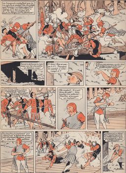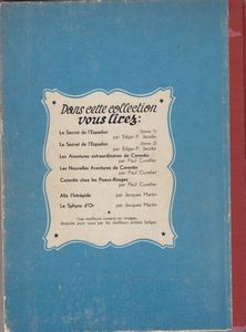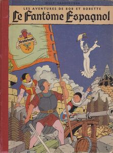 remarques: | 2ème édition du fantôme espagnol, similaire à l'édition 1952, mais à l'impression peut'être un peu moins marquée que l'album 1952, édition Lombard belge, toujours 7 titres au 4ème plat, dernier titre le sphinx d'or (toujours écrit sphynx d'or) commentaires: voir album 1952 Information Bob et Bobette (en néerlandais Suske en Wiske) ou parfois M. Lambique, Bob et Bobette, est une série de bande dessinée belge de langue néerlandaise, créée par Willy Vandersteen en 1945 dans le quotidien De Nieuwe Standaard, elle a été publiée en français pour la première fois dans le Journal de Tintin en 1948 Bobette vit avec sa tante Sidonie et ne se sépare jamais de sa poupée Fanfreluche, son grand-frère, Ricky, partage un temps ses aventures avant de disparaître, un jour, Bobette et Sidonie recueillent un jeune naufragé du nom de Bob sur l'île d'Amphoria, depuis lors, Bob, Bobette et Sidonie parcourent le monde et le temps, grâce au Télétemps, une machine à voyager dans le temps créée par le professeur Barabas, le trio est vite rejoint par Lambique, le brave voisin lourdaud et impulsif mais d'intelligence limitée, puis Jérôme, un homme à la force herculéenne et au langage laconique particulier Lambique (Lambik en néerlandais, d'après la bière gueuze lambic) est un personnage apparu en 1946 et accompagnant Bob et Bobette, Lambique est un homme d'âge mûr, au crâne dégarni portant six cheveux seulement, il vit avec Jérôme, ses voisins sont tante Sidonie et les jeunes Bob et Bobette, de caractère dominateur, il veut toujours avoir le dernier mot, mais sait utiliser la ruse plutôt que la force, même si celle-ci ne lui fait pas peur (il comprend toujours un peu tard qu'il n'est souvent pas de taille à affronter n'importe qui), casanier, il accompagne souvent sans le vouloir les deux enfants dans leurs aventures, mais cela lui permet de les protéger, d'esprit rationaliste, il a parfois du mal à admettre les phénomènes surnaturels auxquels il assiste au cours de ces aventures: il entre ainsi, avec Bob et Bobette, dans le repas de noce, un tableau de Pieter Brueghel l'Ancien, dans le fantôme espagnol, il sera même transformé en centaure dans la princesse enchantée. Suske en Wiske apparaît pour la première fois dans le quotidien flamand De Nieuwe Standaard le 30 mars 1945 sous la plume de Willy Vandersteen, la première histoire, Ricky et Bobette, met en scène un autre garçon, Ricky, le frère de Bobette, qui sera vite remplacé par Bob qui apparaît dès le récit suivant, l'île d'Amphoria, cette bande dessinée sera ensuite publiée dans d'autres périodiques flamands tels que De Standaard, De Bond ou encore Ons Volkske, de 1948 à 1959, des aventures de Bob et Bobette sont publiées dans le Journal de Tintin et son équivalent néerlandophone, Kuifje, Vandersteen y crée, sous l'influence de Hergé, des récits (rassemblés en albums dans la Série bleue) qui restent considérés comme les plus belles aventures de ses héros dès 1951, afin de faire face à la demande croissante, Vandersteen met en place autour de lui un studio composé de dessinateurs et de scénaristes, dont Paul Geerts, qui devient responsable du studio et principal dessinateur à partir de 1969 et jusqu'à la mort de Vandersteen en 1990, année à partir de laquelle Geerts devient crédité comme auteur des nouveaux albums, dans la foulée, ont été publiées des séries dérivées, comme les farces de monsieur Lambique en 1955, Jérôme de 1964 à 1982, puis les fabuleux voyages de Jérôme jusqu'en 1985, il existe aussi depuis 2006 une série P'tit Bob et Bobette, séries de gags mettant en scène les personnages à l'âge de cinq ans, bien qu’ils ne se soient rencontrés que plus tard, quelques séries d'édition entre autres: - la bleue (8 épisodes) publiée dans Journal de Tintin entre 1948 et 1959, réédités avec refonte du coloriage 1993-1997, édition Standaard - la rouge en bichromie = 56 albums (les albums 25 à 56 sont en bichromie, les albums 57 à 66 n'existent pas (les 56 premiers albums ainsi que les 6 albums paru au Lombard sont réédités dans la série rouge Erasme) - la rouge en quadrichromie qui commence avec le no 67, pour plus de cohérence entre les différents pays qui n'avaient pas forcément édité les premiers albums dans le même ordre, Vandersteen a en effet décidé de commencer la nouvelle série en couleurs à partir du no 67 (le dernier numéro recensé étant le no 66), plusieurs albums seront réédités dans cette série dont le premier Ricky et Bobette (no 154) et le second l'île d'Amphoria (no 68) |