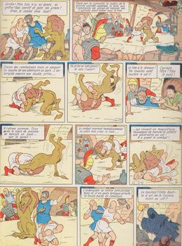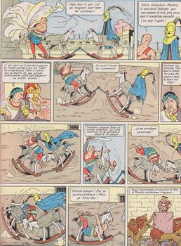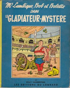 remarques: | édition Lombard belge broché, typo, imprimerie Periodica, 63 pages, série bleue, couverture duplex vernie, 4ème plat peau d'ours, 19 titres, dernier titre: le gladiateur-mystère aventures gauloises et romaines sous l'ère de Néron (Lambique, Bob et Bobette sont déjà dans l'époque et ne seront pas transmutés) les trois amis sont emmenés à Rome comme esclaves, ils se joignent à des rebelles qui se battent contre Néron dont le gladiateur-mystère, leur chef et l'alchimiste qui fabrique de l'or, Néron sera déchu et condamné à l'exil (mais ne se suicidera pas) les personnages: - le gladiateur-mystère (alias Lambique mais pas dès le début) - l'homme masqué au manteau violet = l'empereur Néron - Archimède l'alchimiste - Titus, le vieux lion (sans dents ni griffes) - Torocolos, le gladiateur géant et borné >> p. 4 Lambique qui se prend pour Obélix avant l'heure >> p. 7 1ère apparition de l'homme au manteau violet >> p. 12 lutte contre Torocolos après quoi Lambique sauve la vie de Néron et devient brièvement commandant de la garde prétorienne >> p. 18 1ère apparition du gladiateur-mystère (ce ne peut pas être déjà Lambique) >> p. 27 lutte entre Titus et l'aubergiste >> p. 54/56 le curieux combat entre le gladiateur-mystère (sur un cheval à bascule) et le gaulois Lambique (qui était donc le vrai gladiateur-mystère?) >> p. 63 la défaite de Néron obtenue par ruse >> un album tout à fait dans la lignée des Bob et Bobette |