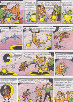 remarques: | Lambique appelé à prendre la place du roi Octave Ier à Bazaria où une conspiration se trâme pour déclarer la guerre à l'état voisin de Solidia alors que l'ombre (du vrai roi Octave Ier emprisonné par les conspirateurs) lutte d'abord contre Lambique, mais finit par devenir son allié contre les conspirateurs >> p. 23 Jerôme qui appelle Lambique: son biquet Lambique veut faire bénéficier le peuple de Bazaria des bienfaits du progrès technique en fabriquant de nombreux gadgets, ce sera le semeur de joujoux. >> p. 24/26 la Tour Interdite qui fournit de l'énergie atomique à Bazaria les conspirateurs cherchent alors à s'emparer de Bazaria en menaçant le peuple de la bombe atomique (en réunissant les particules Atomas et Neutronos) >> p. 28 l'ombre qui est emprisonnée dans le faisceau lumineux d'une lampe de poche >> p. 45 petite explication sur la théorie atomique >> p. 46 les molécules atomas et neutronus qui veulent se réunir >> en général scénario et graphisme typiques pour les aventures de Bob et Bobette sur toutefois une idée originale et amusante |