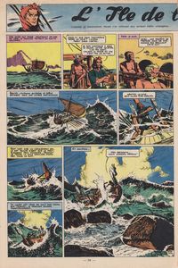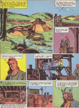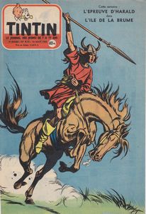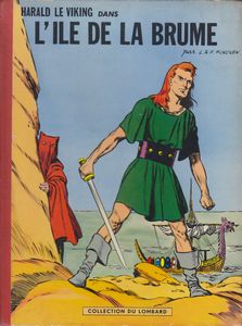 remarques: | album Lombard français, cartonné, ce n'est plus l'imprimerie von Cortenbergh, mais Charles Bulens, 64 pages avec point Tintin, 4ème plat en damiers, 26 titres, dernier titre: l'énigmatique Monsieur Barelli (mais plusieurs titres du début tel le mystère de la pyramide et Alix l'Intrépide ne sont plus mentionnés), n.b. dernier titre de l'édition belge = ça, c'est du sport, récit paru dans le Journal Tintin du no 406 à 436 1956-1957 Norvège, royaume du roi Helge, les marins Snorri et Harald rapportent au roi Helge le tribut de la terre verte (= Groenland), combat avec la flotte suédoise, Harald est accusé de trahison, après avoir subi l'épreuve d'Odin, Harald est exilé au delà de l'île de brume, c'est à dire vers le Vinland d'Erik le Rouge (= l'Amérique), Ragnard et son équipage l'accompagnent, naufrage sur une île près de la côte américaine, capture d'un requin qui fera office de pirogue pour rallier le continent >> p. 14 le grand Ting et le jugement d'Odin >> p. 21 la carcasse du requin utilisée comme pirogue premier contact avec les peaux-rouges iroquois, combat avec la pieuvre géante, la colonie d'Harald prend de l'ampleur, mais se heurte à l'hostilité des iroquois, finalement, les peaux-rouges vaincus font la paix avec les vikings, Tuskarora, le fils du chef se prend d'amitié avec Harald et tous deux partent à la recherche de Ragnard, lieutenant d'Harald et ses autres compagnons capturés par les Mohawks >> p. 28/29 le combat original avec la pieuvre >> p. 33 la colonie viking en pleine expansion >> p. 40 l'attaque des iroquois brisée par des abeilles une année plus tard, Harald fait parvenir son tribut à son roi, mais ses navires sont attaqués près de l'île de la brume par des pirates, Harald leur prépare alors un piège et soumet les pirates dont le chef n'est autre que son ancien ami Snorri >> un bon début de série avec un scénario respectable et un bon graphisme, toutefois l'impression et le coloriage comme publiés dans le Journal Tintin étaient encore meilleurs (voir annexe) à noter - une anomalie en page 14 avec l'archer phrygien qui n'a rien à faire dans les pays du nord - les pages 5 et 6 sont interverties annexes - couverture de l'album - couverture du journal Tintin y compris une planche imprimée dans le journal - 4ème plat et page de garde de l'album - un extrait de l'album à noter: la différence de qualité entre la planche magazine et la planche album Information - il n'y eut que deux autres albums publiés par les éditions Lombard: l'escadre rouge et l'escale de la peur ainsi que la lueur verte aux éditions Chlorophylle, malheureusement en N&B ce qui enlève tout le charme comme édité dans le journal Tintin (>> voir le titre la lueur verte) c'est en 1956 que Liliane et Fred Funcken lancent cette série dans Tintin, ils ont déjà une bonne expérience avec le succès du Chevalier blanc et une solide réputation dans le domaine de la bande dessinée à sujet historique Harald le Viking est un guerrier viking aux aventures pleines de panache cette série ne dure cependant pas longtemps, ne rencontrant pas le succès escompté, publiée dans Tintin entre 1956 et 1967, elle ne compte en fait que quatre aventures "à suivre" et deux récits complets (le fils de Thorolf et "pour un peu de cuivre"), deux récits seront dessinés par Mouminoux: le drakkar aux voiles noirs et le glaive de Thor des albums sont édités à partir de 1958 chez Le Lombard et Chlorophylle, une nouvelle édition dans la collection "Bédingue" en 1983 échoue pareillement à s'imposer, plus tard, en 1996 la tentative des éditions Lefrancq est stoppée au bout d'une année à cause de difficultés financières |