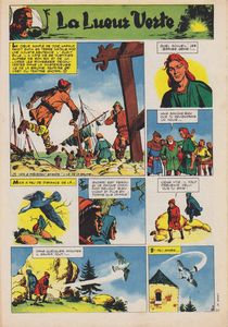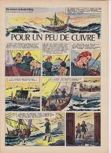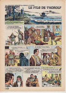 remarques: | A) la lueur verte 1957 62 planches dossier 464B - épisode qui suivit directement l'épisode de l'île de la brume (1956), la lueur verte fut publiée dans le Journal Tintin à partir du no 463 au no 504 1957-1958, 2ème épisode à 62 pages (les albums suivants n'auront plus que 32 pages) - ce récit ne fut pas immédiatement publié en album qui ne paraîtra qu'en 1980 par les éditions Chlorophylle, mais une lueur verte en noir&blanc, ce qui enlève tout le charme de la version colorié du Journal Tintin - ce sera le deuxième et le dernier récit vraiment respectable des aventures d'Harald le viking, les albums suivants publiés en 1967 et 1968 (1962 dans le Journal Tintin) ne seront plus que le pâle reflet des deux premières aventures d'Harald le viking l'histoire de retour en Norvège après avoir éliminé le traître Snorri dans l'île de la brume, Harald reçoit comme récompense le fief de Sigurd en Ecosse, mais il est à nouveau confronté à de dangereux adversaires Ogir, le conspirateur, lui envoie un descendant des Sigurd (un Scot) pour assassiner Harald durant son sommeil l'assassinat ayant échoué, Ogir réussit à s'enfuir pour rejoindre son maître en Ecosse mais en débarquant, Harald est déjà observé par un monstre mystérieux >> pl. 9 les guerriers Scot >> pl. 12 première apparition du monstre entretemps, Harald, Tuskarora et Ragnard arrivent aussi en Ecosse où ils subissent déjà plusieurs attentats, un soir, ils observent un pêcheur attiré par une curieuse lueur verte, Tuskarora et Ragnard intrigués par cette lueur partent en reconnaissance et disparaissent tandis que Harald est capturé par un groupe de Scots qui se font à leur tour attaquer par le monstre, Harald en profite pour se libérer et part à la poursuite du monstre qui disparait subitement. >> pl. 20 la lueur verte n.b. haut-fond = élévation du fond de la mer un peu plus tard en explorant les caves du château des Sigurd, Harald découvre le trésor des Sigurd, à la suite d'un incendie dont il est victime, Harald décide de se laisser passer pour mort afin de mieux continuer son enquête, dans une forêt, il délivre un jeune Scot en passe d'être sacrifié par un druide, un peu plus tard le jeune Scot disparait à son tour encerclé dans une grotte par ses ennemis, Harald, grâce à l'anneau des Sigurd qu'il porte au doigt, découvre un passage secret >> pl. 53 l'anneau = l'oculus mundi = l'oeil du monde des anciens = l'hydrophane, cette pièce opaque a la propriété de devenir transparente lorsqu'on la plonge dans l'eau, à l'air libre, elle ne perd sa limpidité que peu à peu au fur et à mesure de l'évaporation de l'eau absorbée, les minéralogistes de jadis considéraient cette pierre comme une merveille unique en avançant dans le passage, Harald découvre une mine d'émeraudes (d'où provenait la mystérieuse lueur verte) et où des esclaves (dont Ragnard, Tuskarora et le jeune Scot) travaillent à extraire des émeraudes gardés par des hommes d'armes après avoir libéré les travailleurs, Harald et sa troupe assiègent la demeure du gouverneur et démasquent celui-ci qui contrôlait la mine et qui se déguisait en monstre avec une peau d'ours, il se tuera dans sa fuite en tombant dans un précipice avec son sac rempli d'émeraudes B) diverses planches et couvertures des aventures de Harald le viking parues dans le Journal Tintin (pages détachées du journal) - couverture du no 410 du 30.8.1956 sur l'île de la brume - 13 planches sur l'île de la brume à noter: l'impression très soignée de certaines planches du journal ce que l'album Lombard n'arrivera plus à reproduire de la même façon - 2 RC parus en 1966 dans le Journal Tintin a) le fils de Thorolf 6 planches dans le no 932 du 1.9.1966 y compris un Tintinrama sur les bateaux des vikings un viking se fait passer pour le fils du noble Thorolf, mais se fera démasquer par Harald b) pour un peu de cuivre 6 planches no 988 1967 Harald sauve des colons vikings qui exploitent des mines de cuivre d'une attaque des sauvages indigènes - 6 planches sur l'épisode l'escadre rouge - 2 planches sur l'épisode l'escadre de la peur >> ces planches dans ce dossier à titre de documentation pour les illustrations de Funcken, également avec celles du chevalier blanc (voir ce titre) et autres illustrations de Funcken (trône de Gilgit, Capitan) |