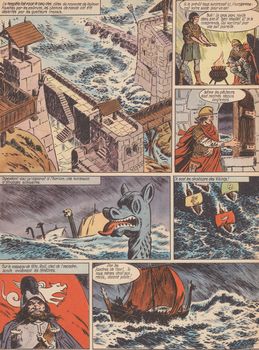 remarques: | récit paru dans le Journal Tintin no 693 à 703 (1962) incursion viking sur les terres normandes menée par Rolf, le brutal dont le brave Harald fait partie du groupe, les troupes de Rolf sont repoussées, mais Harald réussit à sauver la situation et la victoire revient aux vikings, trahison de Rolf qui essaie d'usurper le trône du jeune Eudes, Harald soumet Rolf et rétablit l'héritier légal sur le trône >> p. 14 le brave et fort Harald >> le scénario est plus que banal, même un peu comique et le graphisme baisse nettement en qualité n.b. à partir de cet album, le peau-rouge Tuskarora n'apparaîtra plus dans les aventures de Harald le viking |