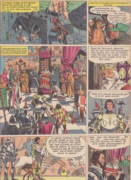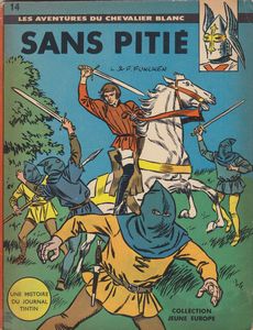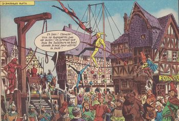 remarques: | 6ème épisode, récit paru dans le Journal Tintin du no 597 à 611 1960, album Jeune Europe 14, 32 pages le trésor royal confié au comte de Carolis, envoyé du roi, est dérobé, le duc de Garcia soupçonne Jehan de Dardemont qui est capturé par les troupes de Garcia, mais délivré peu après par les hommes de Ventregai, le roi des bateleurs, Garcia s'enfuit, mais il sera pourchassé et capturé à son tour >> p. 21 Jehan déguisé en lépreux >> p. 27 les bateleurs au service de Jehan >> un album au graphisme peu soigné, avec un scénario sans grande envergure et semi-comique n.b. pas d'apparition du chevalier blanc dans cet épisode |