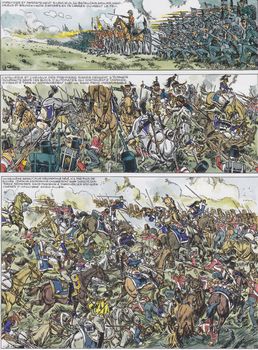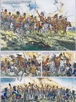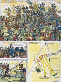 remarques: | album juillet 1993, réédition novembre 1993 sous le titre "Waterloo" sans aucun changement, même couverture 18.6.1815 Napoléon à son quartier général de la ferme du Caillou étudie s on plan de bataille >> p. 5 à 7 l'affaire des adolescents trouvés et recrutés pour l'armée dans les hospices de l'Empire et l'intervention des hussards de la mort du duc de Brunswick >> p. 9 le matin du 18.6. Napoléon est sûr à 90% de gagner la bataille >> p. 12 le messager français abattu qui portait l'ordre de l'empereur à Grouchy de rallier les troupes à Waterloo (vérité historique?) >> p. 13 le fusil à vent (air comprimé?) la bataille commence seulement à 11.30 heures à cause du terrain très mouillé, l'assaut sur Hougoumont défendu par Mac Donald à la tête de la garde royale britannique, assaut mal préparé sans soutien d'artillerie, >> p. 14 Napoléon y avait quand même pensé l'assaut principal conduit par Ney se concentre sur le centre anglais, mais le sol toujours encore mouillé ne permet pas à l'artillerie française de provoquer l'effet destructeur attendu sur un sol sec, l'assaut sur la Haie Sainte reste indécis, mais l'aile droite française menée par Durutte s'empare de Papelotte et atteint même le plateau St-Jean malgré une charge de la cavalerie légère de Picton, ailleurs les fantassins anglais embusqués dans les champs de blé repoussent les français qui sont également chargés par la cavalerie lourde de Ponsomby, la pagaille règne dans les troupes françaises, toutefois la cavalerie française intervient et repousse les forces de Ponsomby qui meurt dans la mêlée >> p. 18 la remarque de Wellington à un artilleur qui veut prendre Napoleon comme cible: "non, au cours d'une grande bataille, les commandants en chef ont mieux à faire que de se tirer les uns sur les autres" entretemps, l'artillerie française se déchaîne enfin sur Hougoumont qui résiste toujours, à 16.30 heures les cuirassiers de Milhaud, env. 5000 cavaliers = la plus belle cavalerie qui se puisse trouver conduits par Ney chargent les fantassins anglais qui se forment en 13 carrés >> p. 29 les nouveaux obus anglais "shrapnell" malgré de lourdes pertes de part et d'autre, plusieurs carrés anglais résistent encore, mais les anglais faiblissent, c'est alors que Blücher et ses 30'000 prussiens arrivent à Plancenoit sur la droite française dirigée par le général Mouton (on attend Grouchy, c'était Blücher) de 16.30 à 18.00 heures, Ney et les cuirassiers ne cessent de charger les carrés anglais qui finissent par être disloqués, mais Ney et ses cavaliers ne sont pas immédiatement suivis par les fantassins et à l'arrivée de Blücher, les carrés anglais résistent encore la garde impériale mène une dernière charge sur le centre-droit de Wellington, mais l'offensive est dévoilée à Wellington par un transfuge français et Wellington met aussitôt un dispositif de défense en place, la garde impériale sera repoussée à 21.30 heures c'est la retraite pour l'armée française, retraite qui finira en débâcle, Napoléon et Ney en réchapperont, mais ce sera la fin de l'épopée napoléonienne >> une fresque magnifique, un récit bien développé et bien expliqué avec un graphisme de haute qualité n.b. Waterloo = la défaite qui aurait pu être évitée, et si Napoléon perd la bataille de Waterloo, il y gagne en noblesse dans le récit de Funcken qui ne cache pas ses sympathies pour Napoléon et l'armée impériale, tout en respectant Wellington et les anglais |
