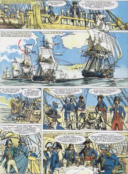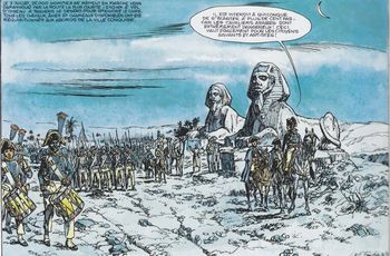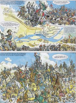 remarques: | histoire de la campagne d'Egypte avec Bonaparte qui sera appelé par les égyptiens, le sultan du feu mai 1798 à Toulon, départ de la flotte française (15 gros et 72 petits vaisseaux de guerre avec 402 transporteurs), Bonaparte emporte avec lui 35'000 soldats et un groupe de savants et d'artistes en tout genre (mathématique, physique, géographie, etc) la flotte partant de Marseille fait escale à Toulon, Gênes, Ajaccio, Civita Vecchia et Rome pour atteindre Malte le 1.6.1798 alors que la flotte de Nelson arrive le même jour devant Toulon vide depuis 15 jours après 10 jours de siège, Bonaparte prend possession du fort fortifié de Lavalette à Malte, Nelson arrive à Alexandrie avant Bonaparte le 28.6.1798, il rebrousse alors chemin et croise au retour sans l'apercevoir la flotte française qui arrive à Alexandrie le 1.7.1798 sans avoir été inquiétée, Bonaparte fait débarquer ses troupes à 15 km d'Alexandrie >> p. 8 le général jambe de bois Caffarelli Alexandrie est rapidement occupée et Bonaparte rassure les habitants, le 7.7.1798 25'000 soldats marchent sur Le Caire, une marche pénible à travers le désert de Damanhour, le 13.7. premiers combats contre les mameluks, Bonaparte dispose ses troupes en carrés, le 21.7. Bonaparte est en vue du Caire et des pyramides, mais il doit encore affronter le gros de l'armée des mameluks (30'000 cavaliers), victoire totale à Embabeh le 24.7. et Bonaparte fait son entrée au Caire >> p. 18/19 batailles des pyramides Bonaparte devient emir haggi = le protecteur, le conseil islamique le nomme aussi général Agha Bounaberdi = le sultan du feu (grâce à ses canons et sa puissance de feu) la Basse et la Moyenne Egypte étaient soumises, Bonaparte envoie Desaix (qui sera surnommé le sultan juste) pacifier la Haute Egypte, mais entretemps la flotte française est détruite à Aboukir (août 1798) Bonaparte doit réprimer un vent de révolte par certains officiers ainsi qu'un soulèvement général en Egypte par les indigènes le 20.10.1798 qui sera écrasé brutalement, le voile philantropique levé s'est déchiré le 28.12.1798 Bonaparte traverse la Mer Rouge à marée basse, exactement où Moise l'avait franchie, les traces de l'ancien canal entre Suez et la Mer Rouge sont retrouvées, au printemps 1799, l'empereur de Constantinople lève une armée puissante qui converge vers l'Egypte par voie de terre et par mer soutenue par les anglais, prévenu Bonaparte se porte à leur rencontre et écrase l'armée ottomane à El Arich le 17.2.1799, puis ce sera la prise de Gaza et en mars celle de Jaffa, Bonaparte fait exécuter 4000 soldats albanais de la garnison mais la peste fait des ravages dans l'armée de Syrie, le 18.3., néanmoins, Bonaparte arrive devant St-Jean-d'Acre, bien fortifiée et appuyée par la flotte anglaise Bonaparte écrase les mameluks à la bataille du Mont Thabor, toutefois St-Jean-d'Acre défendue par l'anglais Sydney Smith et l'émigré français Phélippeaux, un spécialiste du génie et ancien collègue à l'école militaire de Brienne, résiste à tous les assauts de Bonaparte et le 20.5.1799 l'armée de Syrie commence sa retraite vers Le Caire, c'est une défaite pour Bonaparte qui la fait toutefois passer pour une victoire, de retour au Caire, il reçoit un magnifique cheval et un esclave qui deviendra par la suite Roustan, le fameux mameluk personnel du futur empereur Napoleon le 11.7.1799 Sydney Smith avec une puissante flotte débarque 18'000 janissaires à Aboukir, par une intervention rapide, Bonaparte écrase et repousse à la mer les janissaires, une victoire éclatante, mais Bonaparte apprend les défaites françaises en Europe et décide de quitter l'Egypte avec Murat, Berthier et quelques autres privilégiés en laissant l'armée d'Egypte sous le commandement de Kleber, Bonaparte sera alors surnommé le général Bonattrape par ses soldats en Egypte, le 23.8.1799 Bonaparte embarque sur la Mourion et après avoir échappé à la flotte anglaise arrive à Fréjus le 8.10 1799 le 1.11.1799 nouveau débarquement à Damiette des coalisés qui sont à nouveau repoussés, Kleber négocie alors avec Sydney Smith l'abandon de l'Egypte le 28.1.1800, ce sera la convention d'El Arich, mais Londres ne l'accepte pas et somme Kleber de rendre les armes, Kleber refuse victoire à Heliopolis fin février 1800, le 24.4. Ibrahim Bey négocie le départ de ses troupes vers la Syrie, le 14.6. Kleber est assassiné en mars 1801 nouveau débarquement anglais à Aboukir qui ne peut cette fois être repoussé et qui progresse jusqu'à Ramaneh, l'armée française est coupée en deux, l'une à Alexandrie, l'autre au Caire, l'armée française d'Egypte doit alors capituler et une escadre de secours vers l'Egypte doit faire demi-tour >> un superbe album au scénario bien développé et bien expliqué, mais surtout superbement dessiné, particulièrement pour la bataille des pyramides n.b. un troisième album "Austerlitz" sera annoncé, mais jamais publié >> à voir aussi l'excellent album de Martin (meilleur scénario mais moins bien dessiné): "la campagne d'Egypte" |
