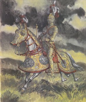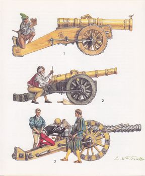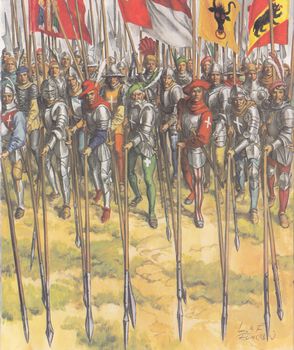 remarques: | titre complet: costumes, armures et armes au temps de la chevalerie, part 2, le siècle de la Renaissance première partie: l'infanterie des batailles A) LES SUISSES - Morgarten 1315 victoire des montagnards sur les chevaliers de Leopold Ier grâce à une embuscade - Sempach 1386 Leopold III (petit-fils de Leopold Ier), vainqueur en Alsace veut écraser les confédérés, 4000 autrichiens contre 1200 suisses, victoire grâce au sacrifice de Winkelried qui fit une brèche dans les lances ennemies - Naefels 1388 nouvelle victoire des confédérés qui se tournent après coup vers le sud: Valais et sud des Alpes contre les ducs de Savoie et de Milan - Arbedo 1422 défaite des confédérés c'est alors que les suisses développent une nouvelle tactique d'infanterie (qui allait servir de modèle à l'Europe entière) avec des piques de 5.80 m de long capables d'arrêter une charge de cavalerie, la hallebarde étant utilisée dans un second temps vers 1465, les Confédérés s'équipent définitivement d'armures généralement complétées d'une salade (= casque à large bord) les guerres bourguignonnes Charles le Téméraire, voulant réunir Flandres et Bourgogne, envahit l'Alsace et la Lorraine, alliée aux suisses, Louis XI pousse les suisses à intervenir victoires de Charles à Yverdon et Grandson en 1476, mais victoire confédérée à la 2ème bataille de Grandson, l'armée bourguignonne est bousculée et prend la fuite sans beaucoup de pertes, mais abandonne un énorme butin >> p. 18 le butin saisi par les suisses reconstituée en moins d'un mois, l'armée bourguignonne met le siège devant Morat, 35'000 bourguignons contre 25'000 confédérés, ce fut un massacre pour les bourguignons encerclés et acculés au lac en octobre de la même année 1476, Charles le Téméraire perdra la vie à la bataille de Nancy les victoires des confédérés assurèrent leur renommée et en 1506 sollicité par le pape Jules II, fut créé la fameuse garde pontificale suisse mais enhardis par les succès de leur infanterie, les confédérés négligèrent la cavalerie et l'artillerie, ce qui provoqua leurs défaites à Marignan (1515) et à La Bicoque (1522) de plus les mercenaires suisses engagés des deux côtés des opposants se battaient fratricidement et par la suite, la confédération interdit le recrutement de mercenaires à l'étranger B) LES LANSQUENETS à l'origine des palefreniers accompagnant le chevalier, inspiré de l'infanterie suisse, Maximilien Ier créa les lansquenets (de l'allemand Landesknechte) qui commenceront à remplacer les contingents suisses suite à leurs défaites de Marignan, Pavie et Bicoque les cercles du Rhin fournirent un grand nombre de lansquenets, mais les plus renommés furent ceux de Souabe, ils furent le prélude aux premiers régiments nationaux armes principales: la pique, l'épée large à deux mains (l'espadon, la claymore chez les écossais) puis l'arquebuse utilisée par les arquebusiers ou mousquetaires C) L'INFANTERIE NATIONALE - les francs-archers créés par Louis XI, cette infantrie ne dura que brièvement - les fantassins réguliers remplacent petit à petit les mercenaires et accompagnent de plus en plus la cavalerie - les bandes, création de 4 premiers régiments nationaux: les bandes de Picardie, Champagne, Piémont et Guyenne qui constituaient une armée nationale permanente - les gardes royaux ou sergents d'armes (sous les rois de France en grande partie constitués d'écossais, yeomen en Angleterre) >> p. 31 les Cent-Suisses (gardes royaux) D) LE BOUCLIER (ou écu pour le chevalier) = l'indispensable complément du combattant >> p. 30 l'évolution du bouclier du XIème siècle au XVème siècle - le pavois = bouclier typique du fantassin - la rondache = petit bouclier rond - la targe = genre d'écu, principalement utilisée dans les tournois - l'adargue = genre d'écu d'origine mauresque et espagnole >> p. 14 le désarçonneur = fantassin muni d'une fourche à ressort (Fangeisen) qui permettait de désarçonner un chevalier portant une armure lisse et bien étanche (armure maximilienne) deuxième partie: la Cavalerie la cavalerie féodale était alors la base de l'armée (l'autre partie était la piétaille), mais ruinés par la guerre de Cent Ans, les chevaliers s'engagèrent dans les compagnies d'ordonnance créées par Charles VII, les hommes d'armes (maîtres) opéraient dans la cavalerie lourde a) les compagnies d'ordonnance bourguignonnes divisées en escadres commandée chacune par un homme d'armes, elles étaient plus disciplinées que celles de France et se distinguaient par leur tenue éblouissante, hélas la "bravoure en habits" ne put pas résister à la piétaille suisse b) les compagnies d'ordonnance autrichiennes en 1477, par mariage avec Marie de Bourgogne, Maximilien d'Autriche prit possession des terres de Bourgogne et conserva le restant des compagnies d'ordonnance de Charles le Téméraire tout en créant ses propres compagnies d'ordonnance c) la condotta cavalerie dirigée par des condottieri et qui fonctionnait comme mercenaires, principalement pour les petits états et principautés d'Italie ils étaient accompagnés des "fanti" d'où est venu le nom de fantassin d) la cavalerie légère - les chevau-légers = archers des compagnies d'ordonnance (aussi appelés chevaucheurs) - les arquebusiers à cheval (armés d'une petite arquebuse) - les dragons, carabins et argoulets (dragon-lancier et dragon arquebusier), le carabin qui utilisait une arme redoutable à canon rayé donna son nom à la carabine, à mentionner aussi: les hussards hongrois - les estradiots = genre de cosaques du XVème siècle, principalement constitués de cavaliers originaires des balkans (grecs et turcs du nom de stratiôtês = soldat en grec) - les cuirassiers et lanciers = cavalerie intermédiaire entre la cavalerie lourde et légère - les reîtres (de l'allemand Reiter), formés par escadrons dirigé par un "Rittmeister", les reître