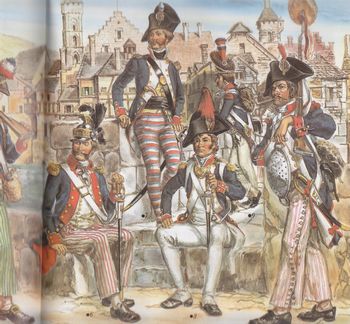 remarques: | album de 138 pages, format 30x26 cm, avec jaquette première partie: l'armée royale et la Révolution en 1789, la France compte une armée de 155'000 hommes (+ 5000 gardes royaux français et 1720 suisses = maison militaire du roi), 32'000 cavaliers, 13'000 artilleurs et une marine de 82 vaisseaux de ligne avec 12'000 marins les 10'000 officiers dont 1300 généraux étaient tous des nobles, la France disposait d'une artillerie redoutable mise au point par Gribeauval et qui passait pour la meilleure d'Europe nouveaux uniformes blancs avec rayures rouges et casque "à la Tarleton" avec aussi le bonnet à poil et le tricorne la cavalerie était formée des - carabiniers avec sabre et carabine - cuirassiers avec double cuirasse, sabre et pistolet - hussards vêtus d'uniformes "à la hussarde" de leur cru, avec sabre courbe et petit mousqueton - dragons avec casque à visière, sabre et mousqueton - chasseurs à cheval = derniers-nés de la cavalerie légère la Maréchaussée remplissait la fonction de Gendarmerie nationale (7500 hommes), il y avait aussi une gendarmerie d'armée l'artillerie était de bonne qualité, son seul handicap était sa mobilité d'où la création dès 1792 de l'artillerie volante suite aux émeutes de la Bastille 14.7.1789, l'Assemblée des électeurs de Paris organise une Garde Nationale commandée par le marquis de La Fayette >> p. 32 description de La Fayette >> p. 34 ces milices prirent aussi le nom de Fédérés, le 30.7.1792 arrivée du bataillon des Fédérés marseillais en chantant le chant de guerre pour l'armée du Rhin = future marseillaise l'uniforme nationale: bleu, blanc, rouge et introduction de la cocarde tricolore: blanc pour les Bourbons, rouge et bleu aux couleurs de la ville de Paris en septembre 1792, la Convention proclame l'abolition de la royauté et le mot "république" fait son apparition, la cocarde devient rouge/bleu et le port de la cocarde blanche était passible de la peine de mort le 21.9.1790 l'Assemblée Constituante avait adopté le drapeau tricolore présentant des bandes verticales dans l'ordre de bleu, blanc, rouge = les couleurs de la liberté encart: la bénédiction des drapeaux >> p. 11 l'arbre de la liberté - un sans-culotte avec le bonnet phrygien symbolisant l'affranchissement des esclaves dans l'Antiquité - fusilier portant le casque "à la Tarleton" >> p. 15 drapeau avec et sans la fleur de lys >> p. 21 l'harnachement dont la selle, la bride, les arçons, les étriers et la schabraque = pièce de drap ou peau de mouton placé sous la selle >> p. 25 les uniformes "à la hussarde" >> p. 41 à 53 différents drapeaux et porte-drapeaux deuxième partie: le temps des volontaires suite à la défection des effectifs de l'armée royale et des émigrés, l'Assemblée Constituante décide de faire appel à des "auxiliaires volontaires" puis à une conscription nationale fin septembre 1791, 3 armées étaient constituées - l'armée du Nord (Rochambeau) - l'armée du Centre (La Fayette) - l'armée du Rhin (Lückner) 28.7.1792 manifeste du duc de Brunswick qui menace les parisiens, août 1792 arrestation du roi et la Convention remplace l'Assemblée Constituante première victoire française à Valmy ("une drôle de bataille", accord secret entre Dumouriez et Brunswick?), la République était instituée, après Valmy, Dumouriez avait envahi la Belgique, avance française sur Worms, Francfort et Mayence, Nice et la Savoie sont enlevées à la Sardaigne le 6.11. nouvelle victoire à Jemmapes, Bruxelles, Liège et Anvers sont occupées, mais ces succès déclanchent une coalition contre la France: l'Angleterre, l'Espagne et le royaume de Naples se joignent à l'Autriche, la Prusse et la Sardaigne déjà en guerre le 21.1.1793 l'exécution de Louis XVI provoque le soulèvement de la Vendée, revers militaires en Hollande et en Belgique, Dumouriez passe à l'ennemi, chute des Girondins (2.6.1793), Toulon se révolte (12.7.) et est livrée à l'Angleterre (27.8.) le 1.8.1793 levée en masse de nouvelles troupes par Lazare Carnot (600'000 hommes fin 1793) qui en profite pour réorganiser l'armée >> p. 66 le système de l'amalgame (l'armée royale diluée dans une armée nationale) création en juin 1794 de l'école militaire de Mars (qui ne durera que peu de temps >> p. 66 la prière à l'Etre suprême... mais ces troupes sont encore fragiles: elles souffrent d'un manque d'équipement, de mauvaise nutrition et d'hygiène, mais le moral reste bon encart: lettre d'un soldat... >> p. 59 l'infanterie révolutionnaire n.b. le tricorne est porté en large lors des batailles et en long lors des marches "en colonne" >> p. 60/61 les volontaires chantant la "Carmagnole", les retroussis = partie du bord d'un chapeau ou d'un vêtement, qui est relevée, repliée vers le haut, synonyme de revers - partie des basques de la vareuse militaire relevée pour la commodité de la marche ou de l'équitation >> p. 69 les hussards dont les hussards de la mort (1792) troisième partie: les ennemis de la Révolution a) vendéens et chouans dès le 3.3.1793 soulèvement du nord de la Vendée, sud de la Loire et Maine-et-Loire avec les meneurs: Cathelineau, Stofflet, d'Elbée, Charette et La Rochejacquelein = son chef le plus prestigieux l'armée vendéenne forte de 40'000 hommes s'empare d'Angers et d'Ancenis, mais échoue devant Nantes et cette révolte sera soumise à Savenay le 23.12.1793 une autre guerre de partisans éclata alors en Bretagne et dans le Maine, appelée "petite Vendée" ou chouannerie leurs chefs furent Cottereau dit Jean Chouan ainsi que Jean Treton les chouans portaient le costume breton typique et le coeur de Jesus comme emblème, les chouans furent définitivement battus par Hoche en 1795 b) les émigrés ceux-ci passèrent en grande partie au service de l'Angleterre (Loyal Emigrants) qui organisa un audacieux plan d'invasion de la Bretagne révoltée via l'île de Quiberon, invasion qui fut toutefois repoussée par l